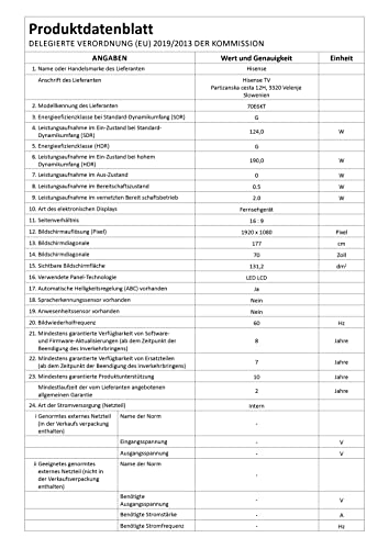 Einzelheiten: Der Hisense E6KT Smart TV überzeugt mit einem unvergleichlichen TV-Erlebnis. Detailreiche Bilder in 4K Ultra HD. 4-mal so scharf wie Full HD: ultrafeine Details in der 4K UHD-Auflösung von 3840 x 2160 Pixeln. 4K Ultra HD ermöglicht scharfe Bilder mit überragender Tiefe, flüssigen Bewegungen und kontrastreichen, lebendigen Details. Die HDR Technologie (Dolby Vision, HDR10, HDR10+ decoding, HLG) ermöglicht einen extraweiten Farbraum, sodass Bilder mit hohem Dynamikumfang dargestellt werden. Für den Zuschauer werden so feinste Details sichtbar. Die UHD AI Upscaling Technologie optimiert das FHD-Signal auf nahezu 4K-Qualität. Anstatt einfach jedes Pixel 4-fach hochzurechnen, analysiert die Hisense UHD AI Upscaling Technologie das Farbspektrum angrenzender Pixel und optimiert die Farbgebung Szene für Szene. Über die personalisierbare Benutzeroberfläche VIDAA U6 lassen sich favorisierte Apps individuell anordnen und blitzschnell aufrufen. Mehr Flexibilität, mehr Individualität und schnellere Reaktionszeit. Mit VIDAA Free lassen sich zudem auch kostenlose Inhalte auf einen Blick abrufen. Die flache Bauweise und der ultrafeine Rahmen verkörpern das minimalistische Design. Hochwertige Materialien gepaart mit ausgefeilter Technik unterstreichen den Anspruch an höchste Qualität. Für die Gamer unter Ihnen bietet der Game Mode Plus pures Spielvergnügen. Mittels ALLM schaltet der Fernseher in Verbindung mit der Spielekonsole in den Game Modus mit der geringsten Latenz. Lästige Einstellungen über die Fernbedienung kann man sich sparen und hat volle Konzentration fürs Spiel.