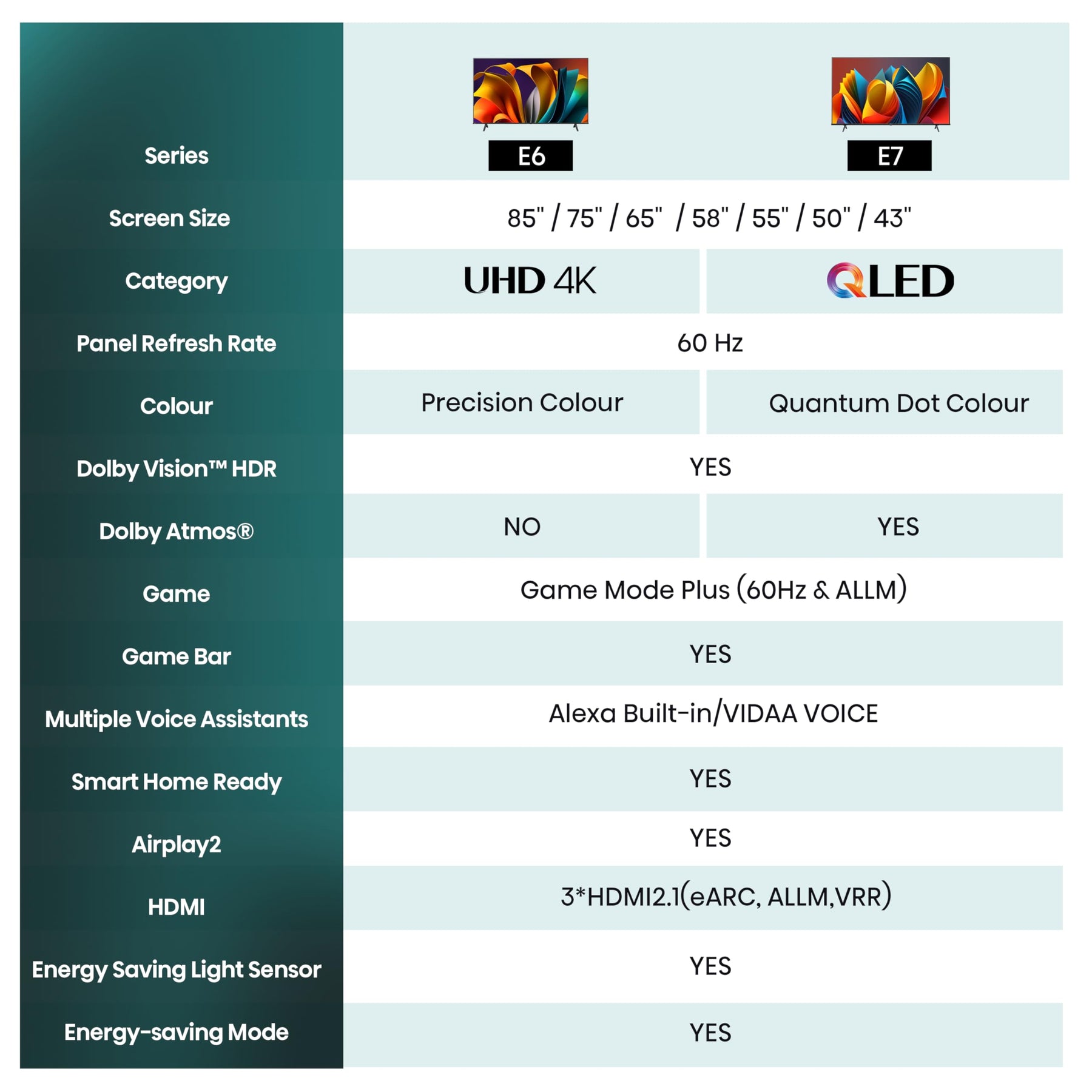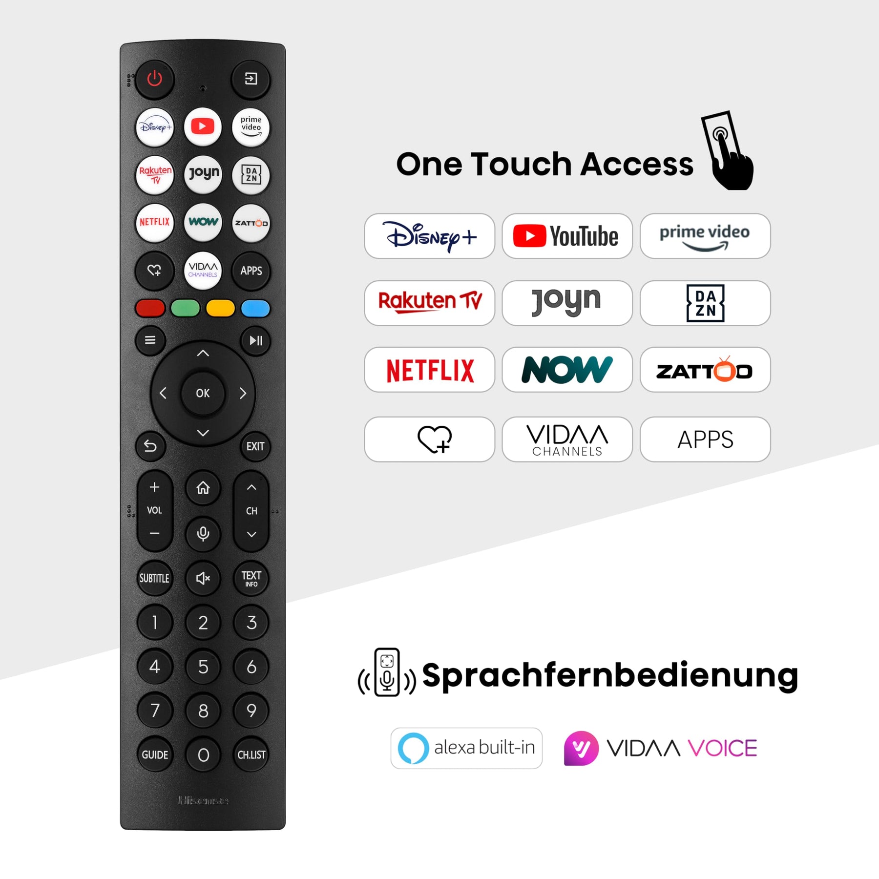 Einzelheiten: Der Hisense E6NT Smart TV besticht durch Bilder in herausragender Schärfe und glasklaren Kontrasten durch eine Auflösung in Ultra-HD mit 3840x2160 Pixeln. Zusätzliche Features wie die Precision Color Technologie sorgen dafür, dass die Bildfarben besonders klar und realitätsnah erscheinen. Die Unterstützung von Dolby Vision sorgt dabei auch in dunklen Szenen für einen maximalen Detailgrad der Bilder. Der verfügbare Filmmaker Mode sorgt außerdem dafür, dass Sie Ihre Lieblingsfilme genau nach der Intention der Filmemacher unverfälscht erleben und genießen können. Auch schnelle Szenen werden dank Smooth Motion scharf und klar dargestellt. Über das VIDAA-Betriebssystem wird eine Vielzahl an Streamingdiensten und Apps bereitgestellt. Diese können dank einfacher und schneller Bedienung jederzeit nach Belieben abgerufen werden. Des Weiteren lassen sich mithilfe der Sprachsteuerung von Amazon Alexa oder VIDAA-Voice Eingabebefehle auch bequem über die Stimme an den Fernseher übermitteln.