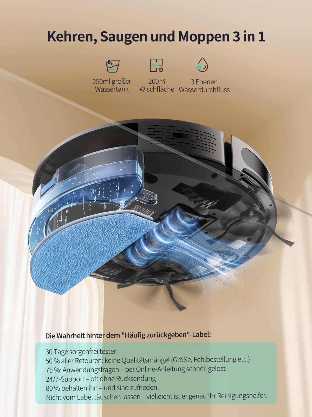 - Die Wahrheit hinter dem "Häufig zurückgegebener Artikel"-Label: 50 % der Rücksendungen betreffen Passform, Farbe oder kurze Nutzung – nicht die Produktqualität. 75 % der Rücksendungen beruhen auf Anwendungsproblemen, die durch unser Tutorial-Video einfach gelöst werden. Unsere Technik-Experten beantworten rund um die Uhr alle Fragen. Statt einer Rücksendung bieten wir Ihnen bessere Lösungen. Beschränken Sie sich nicht auf Bilder oder Labels – probieren Sie es zu Hause aus, wie im Geschäft! 80 % der Kunden behalten es. Lassen Sie sich nicht vom Label täuschen – vielleicht ist dies genau der Reinigungshelfer, den Sie brauchen!