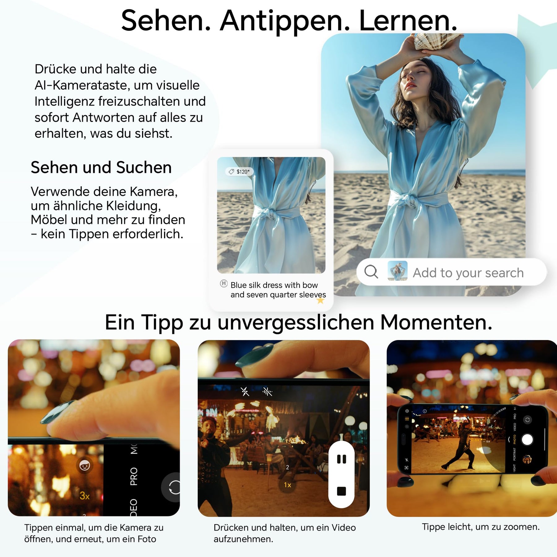 - AI-Kamerataste für sofortige Kreativität: -Starten Sie die Kamera in 1 Sekunde, machen Sie Fotos mit Handschuhen oder tauchen Sie in die Unterwasserfotografie ein. Drücken Sie zum Fokussieren, wischen Sie zum Zoomen und verwenden Sie Google Lens für Echtzeit-Übersetzungen, Einkäufe oder Erkundungen – alles über die entsprechende Taste.