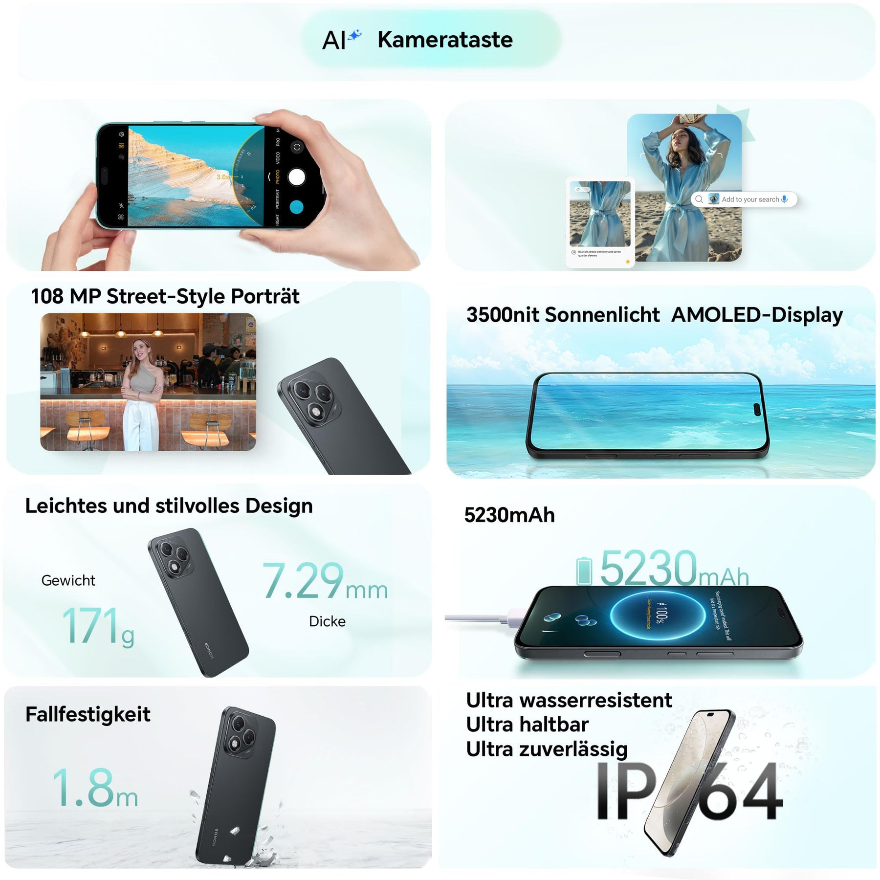 - Leggero e robusto: IP65 + SGS 5-Star Resistenza alle cadute: con un peso di soli 171 g e uno spessore di 7,29 mm, il telefono combina portabilità e durata. Classificato IP65 per la resistenza all'acqua e alla polvere e certificato da SGS per sopravvivere a cadute da 1,5 m, è costruito per resistere alle avventure quotidiane senza compromettere lo stile.
