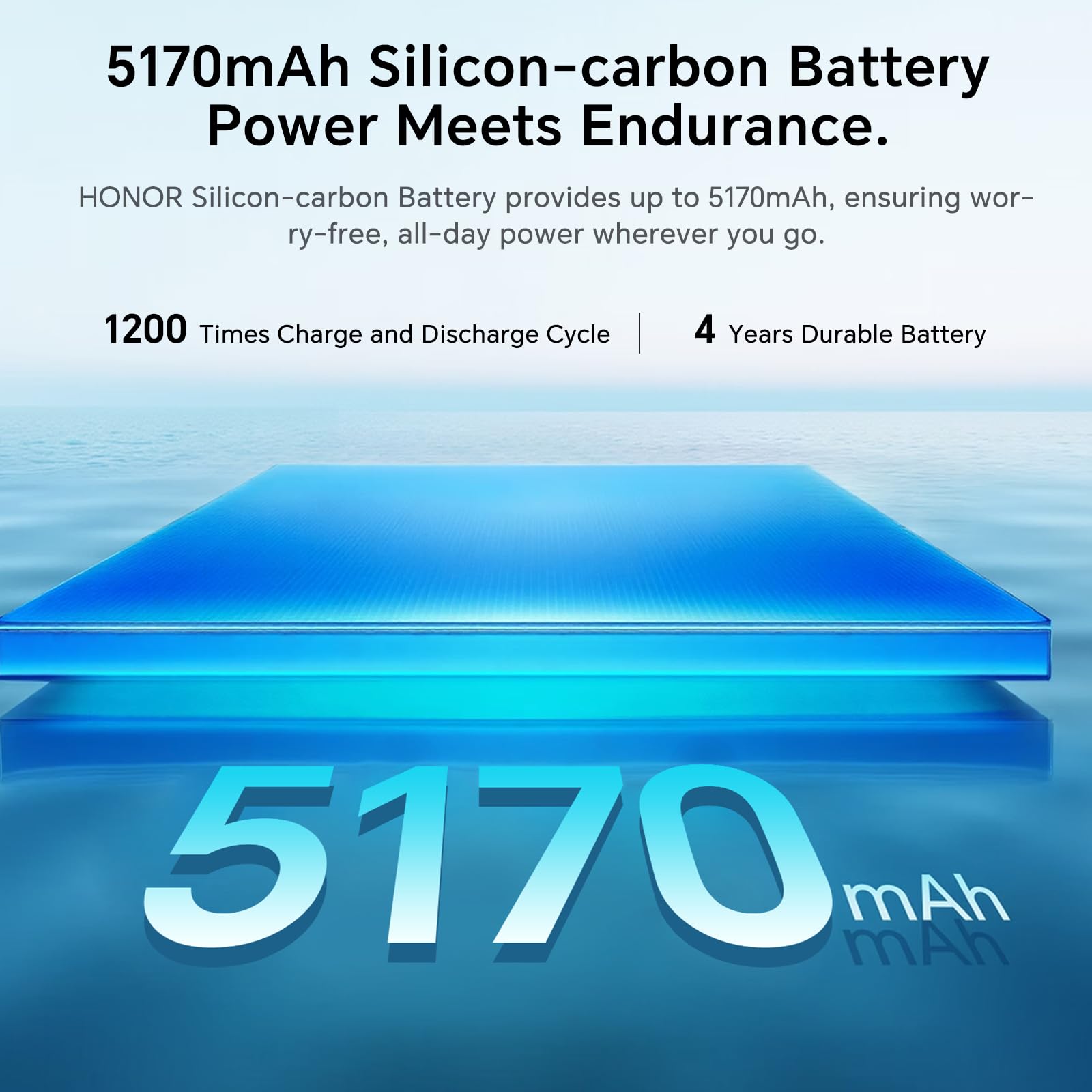 - 5170mAh Silizium-Carbon-Akku: HONOR Silizium-Carbon-Akku bietet bis zu 5170 mAh und sorgt für ausreichend Energie für den ganzen Tag, egal wohin du gehst. Die Ladegeschwindigkeit der Silizium-Carbon-Batterie von HONOR erreicht bis zu 100W und lädt in nur 15 Minuten auf 51% auf.