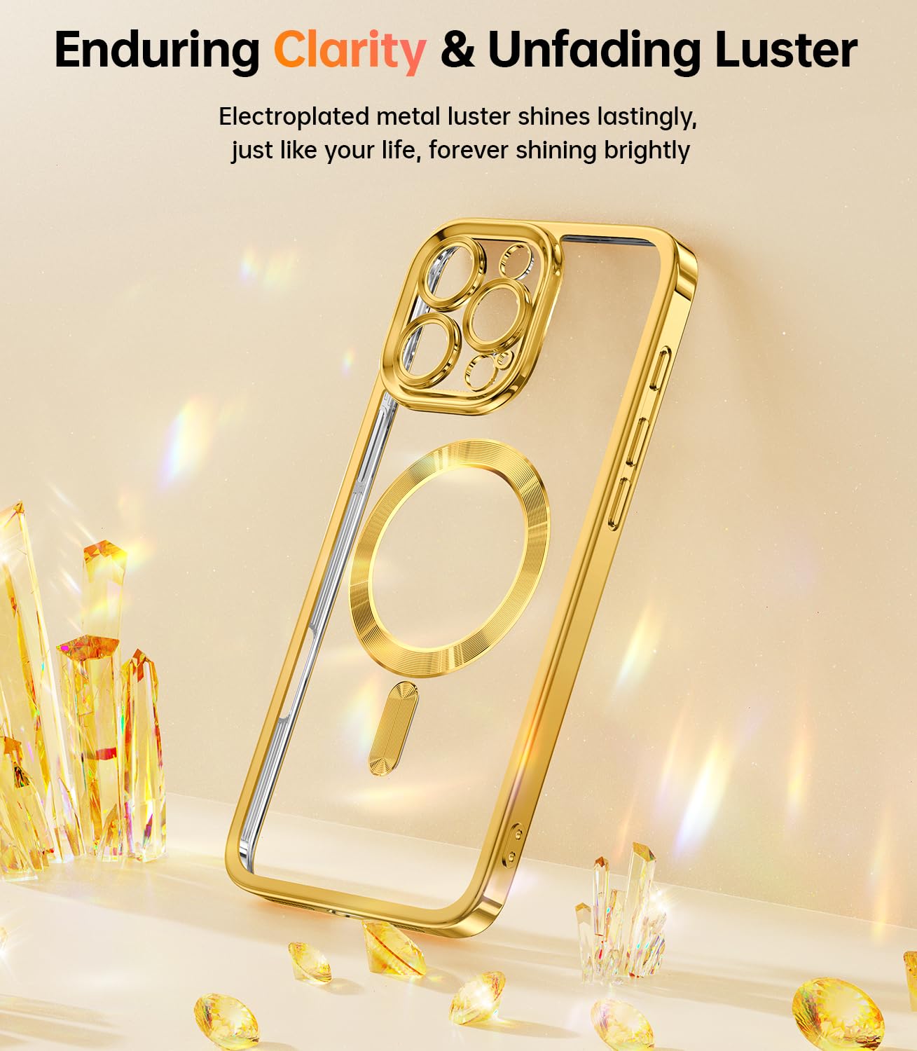 - Metallic Gloss Design: Diese Handyhülle wurde speziell für das iPhone 16 Pro entwickelt. Während die Rückseite transparent bleibt, sind die Kanten, die Kamera und der Magnetring alle mit metallischem Glanz verziert, was sie wirklich einzigartig macht. Das galvanische Verfahren verleiht diesem Gehäuse eine glänzende Farbe, die niemals verblasst oder abblättert.