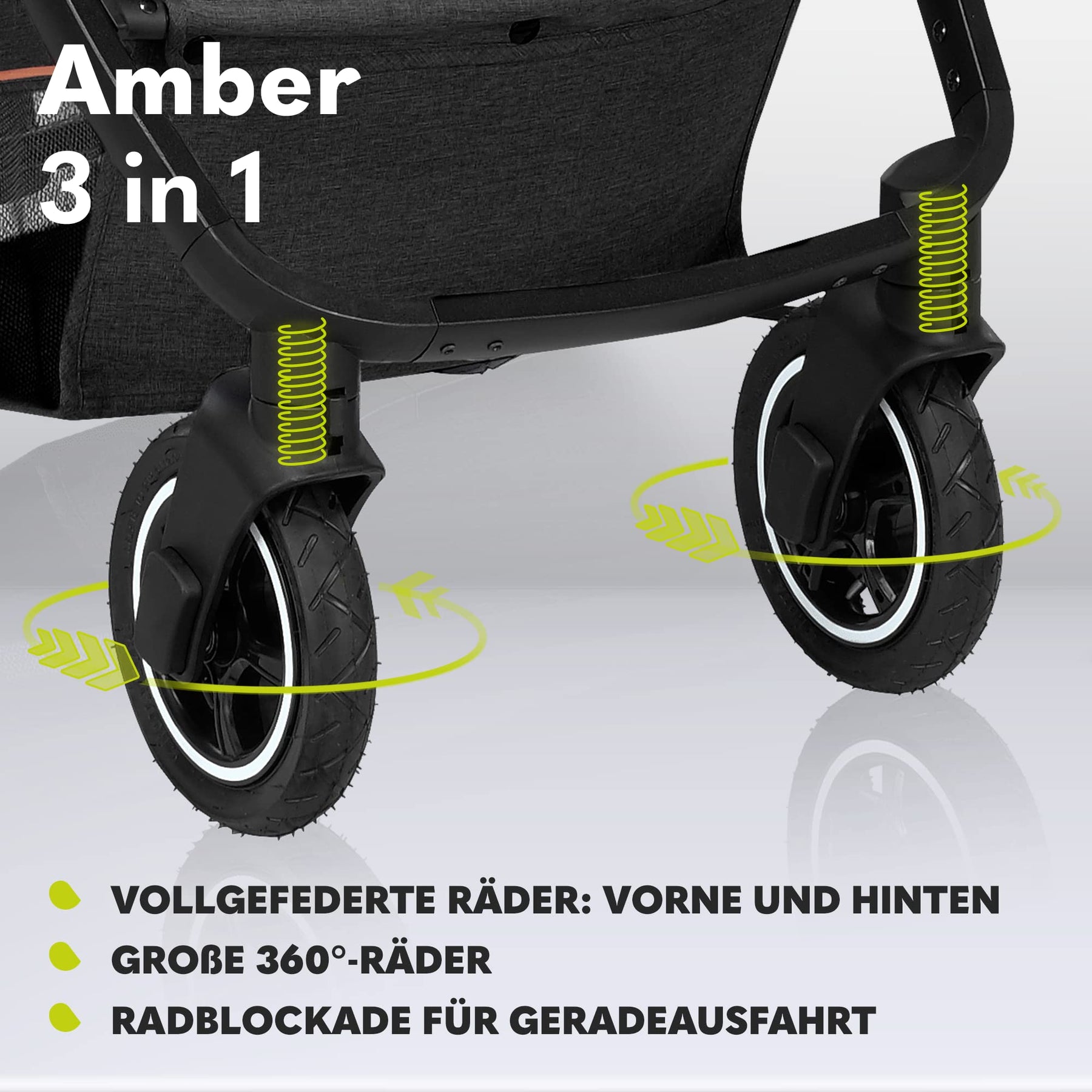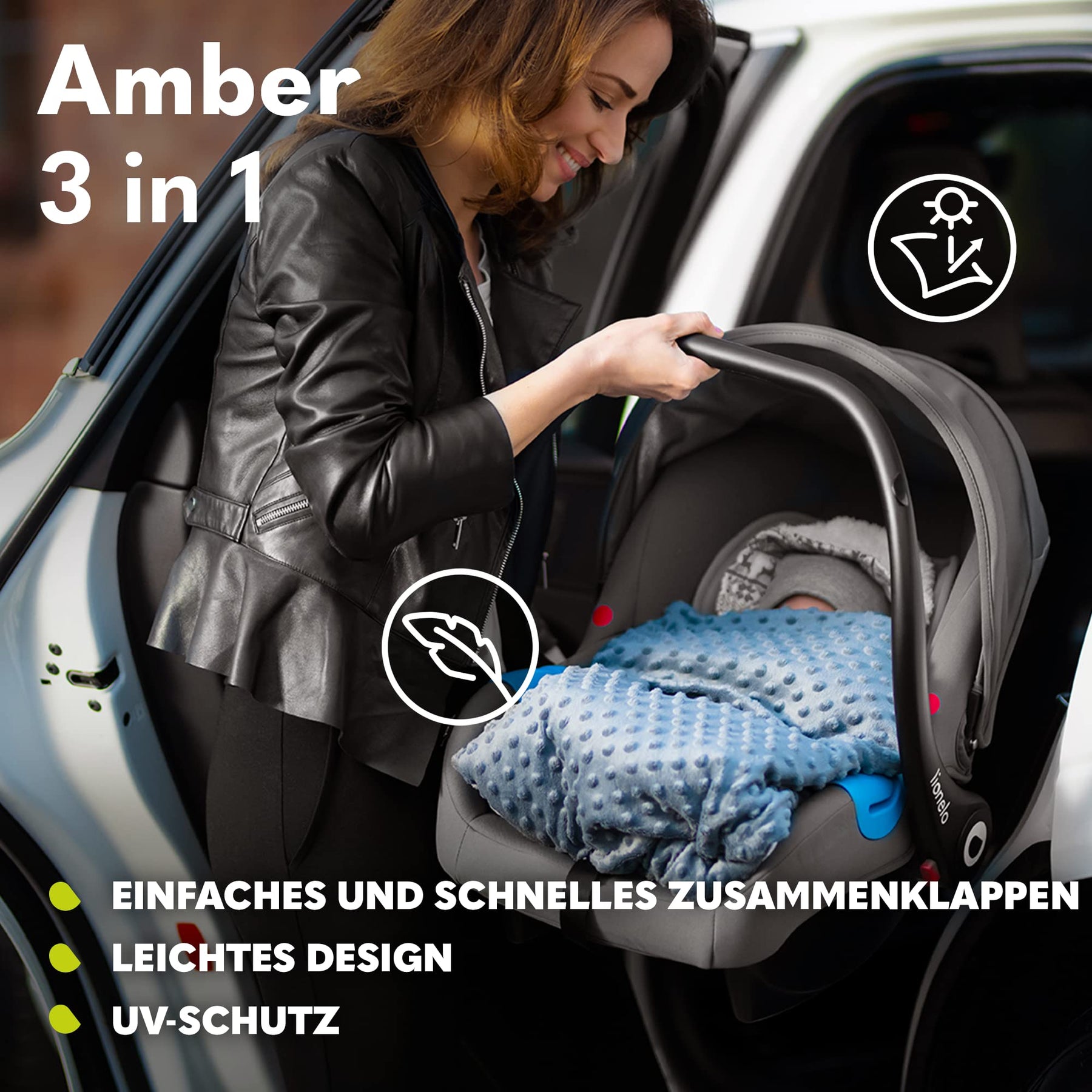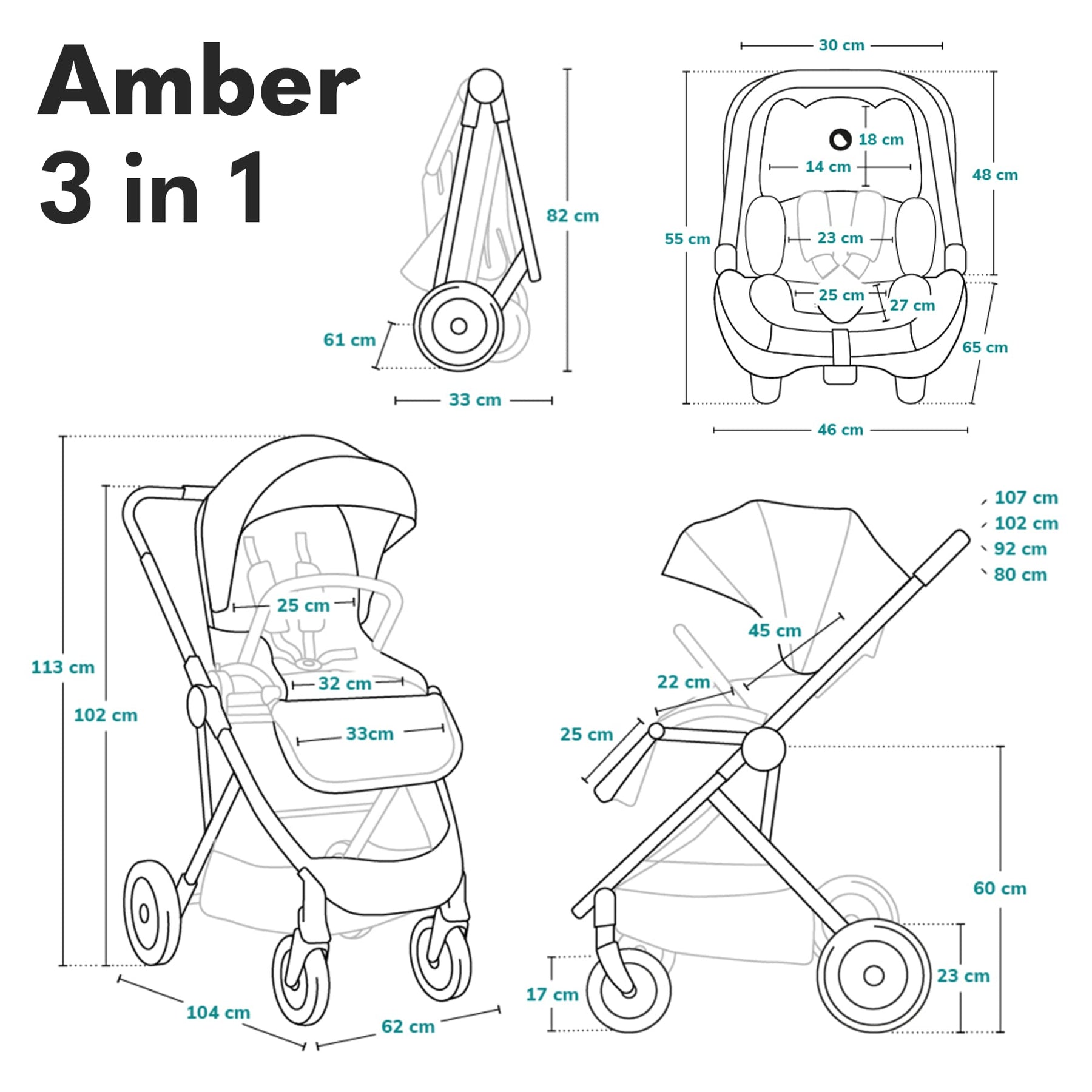 Der Amber 3in1 Kinderwagen ist Komfort und Sicherheit in einem eleganten Stil. Das Set, das aus einem Kinderwagen, einer Tragewanne besteht und einer Autositz, garantiert Komfort sowohl bei einem Spaziergang durch die Nachbarschaft als auch bei längeren Ausflügen mit Ihrem Kleinen. Der Schalensitz in Kombination mit dem Gestell sorgt für große Vielseitigkeit und die Möglichkeit, jeden Moment gemeinsam zu genießen. Der Sitz kann vorwärts oder rückwärts montiert werden, damit Ihr Kleines seine Umgebung beobachten oder Blickkontakt mit Ihnen halten kann, je nach seiner Stimmung und seinen Bedürfnissen. Das Verdeck des Amber Kinderwagens ist größer und länger als bei anderen Kinderwagen, wodurch es Ihren Kleinen nicht nur besser vor Wind, Regen und Sonne schützt, sondern ihm auch mehr Platz bietet. Dank des transparenten Fensters kann Elternteil jederzeit hindurchschauen, um sicherzustellen, dass der Kleine nichts verpasst. Das Netzgewebe im Fenster sorgt für eine hervorragende Belüftung. Das Vordach ist außerdem mit UPF 50+ ausgekleidet, der die UV-Strahlen reflektiert und für die richtige Temperatur im Inneren der Kabine sorgt. Der im Kinderwagen verwendete Stoff ist sehr widerstandsfähig gegen Abrieb und Dehnung und gleichzeitig hautfreundlich für kleine Reisende. Dieses Material ist sehr leicht sauber zu halten.