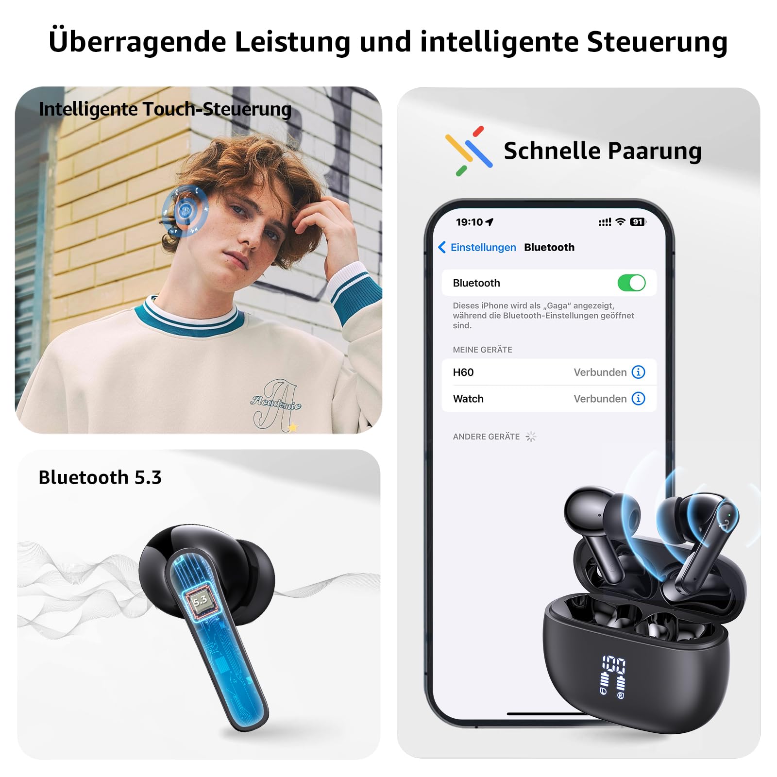 - 💝Sensitive Touch Control & Leistungsstarke Kompatibilität: Die H60-Ohrhörer setzen neue Standards für Audio-Freiheit. Dank der sensitiven Touch-Steuerung können Sie Medien wiedergeben, Anrufe entgegennehmen und Assistenten aktivieren – alles mit einer Berührung. Ihr ergonomisches Design ermöglicht bequeme Bedienung ohne ständiges Greifen zum Telefon. Genießen Sie grenzenlose Freiheit und nahtlose Bluetooth-Verbindung mit all Ihren Geräten, sei es Smartphone, Tablet oder Laptop.