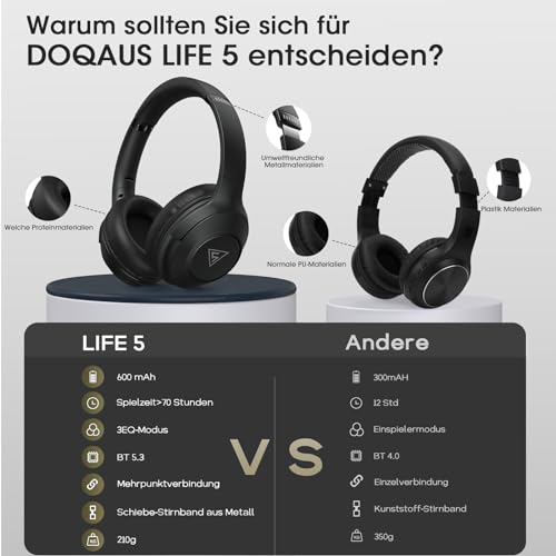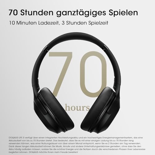 - 【Bis zu 70 Stunden Spielzeit】Mit der Technologie für niedrigen Stromverbrauch und einem 600-mAh-Akku können die kopfhörer mit kabel von DOQAUS bis zu 70 Stunden lang ununterbrochen spielen. Ansonsten werden unsere kopfhörer bluetooth mit einem 3,5-mm-Audiokabel geliefert, mit dem Sie in den kabelgebundenen Modus wechseln können, wenn der Strom ausgeht. Kein Strommangelproblem mehr. Genießen Sie Ihre Musik ohne Unterbrechung