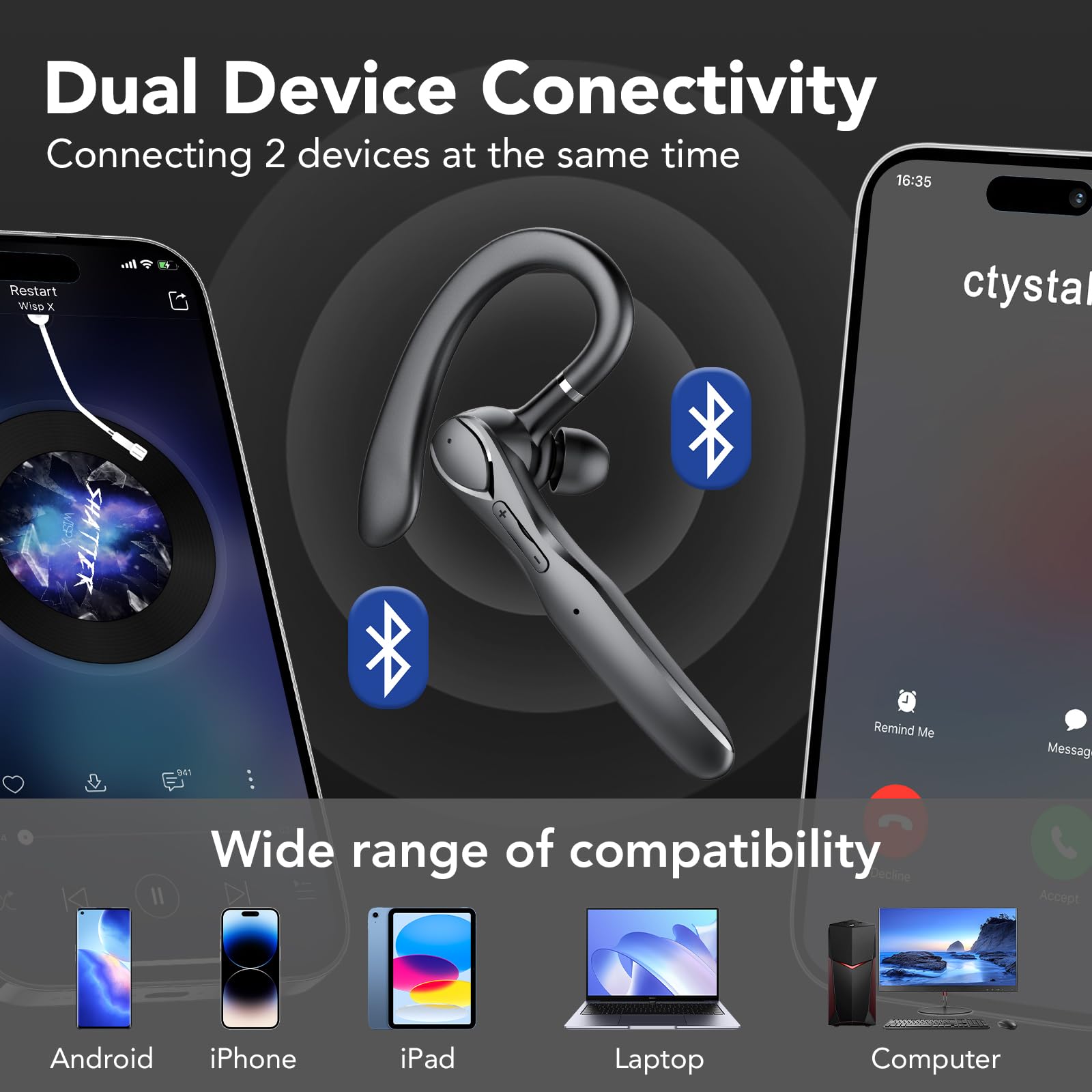 - Bluetooth V5.3: Bluetooth V5.3 headset ist mit den meisten bluetooth geräten kompatibel und hat eine stabile verbindung.Headset bluetooth unterstützt die kopplung mit 2 bluetooth geräten zur gleichen zeit.Zum beispiel können sie Ihr headset mit Ihrem telefon und computer zur gleichen zeit zu verbinden, nicht mehr brauchen, um hin und her zu schalten, um die effizienz im büro zu beschleunigen.