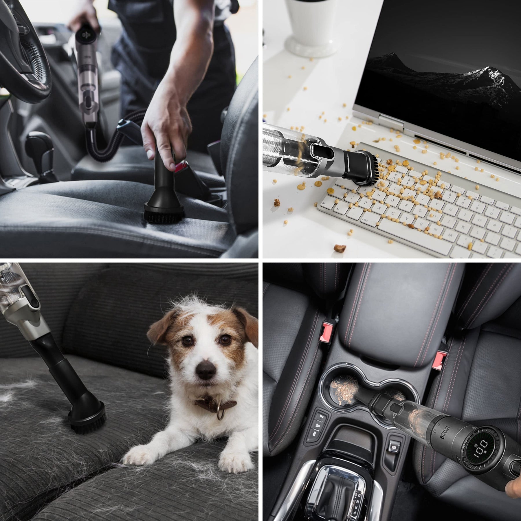 - VIELFÄLTIGES ZUBEHÖR : Effektivere & gründlichere Reinigung durch 5 mitgelieferte Aufsätze für den Akku-Handstaubsauger - Zum Beispiel Fugendüse für enge Räume beim Auto saugen, flexibler Reinigungsschlauch oder Bürstenaufsatz für Tierhaare saugen mit Akkustaubsauger