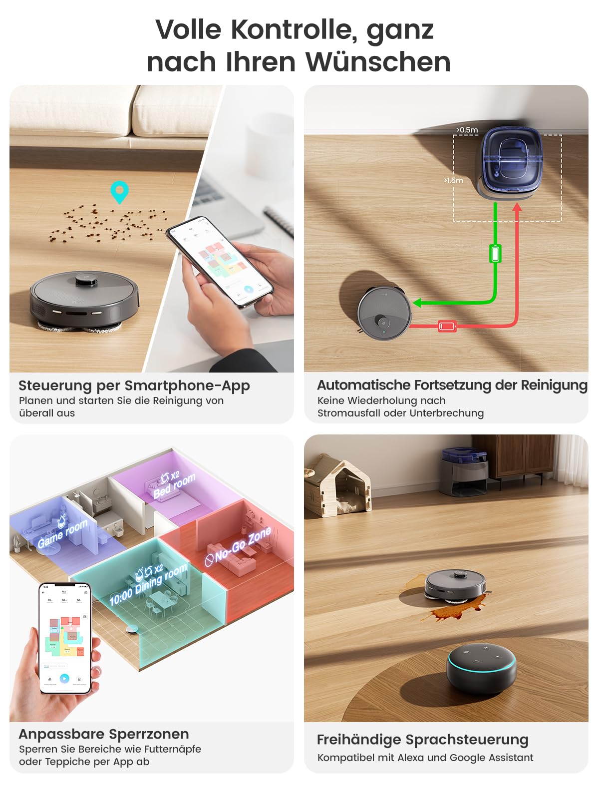 - WLAN-Konnektivität und smarte App-Steuerung: Der Lefant M3 ist mit 2,4-GHz- und 5-GHz-WLAN-Netzwerken kompatibel und gewährleistet so eine stabile und schnelle Verbindung. Sie können den Roboter bequem per App steuern, Reinigungspläne individuell anpassen, den Akkustand überwachen und Reinigungsmodi nach Bedarf einstellen. Darüber hinaus ist der Roboter mit Alexa und Google Assistant kompatibel und ermöglicht so die einfache Bedienung per Sprachbefehl.