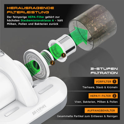 - SO BRINGEN SIE DIE ALLERGEN-BELASTUNG UNTER KONTROLLE. Staubmilben ernähren sich von menschlichen Hautschuppen und produzieren große Mengen an schädlichen Stoffwechselprodukten. Mit dem Brandson Milbenstaubsauger machen Sie den Plagegeistern den Garaus. Dank UV-C Sterilisationslampe, Vibrationskopf und leistungsstarken 300 W Saugleistung erleben Sie ein sauberes und hygienisches Zuhause! | 306909