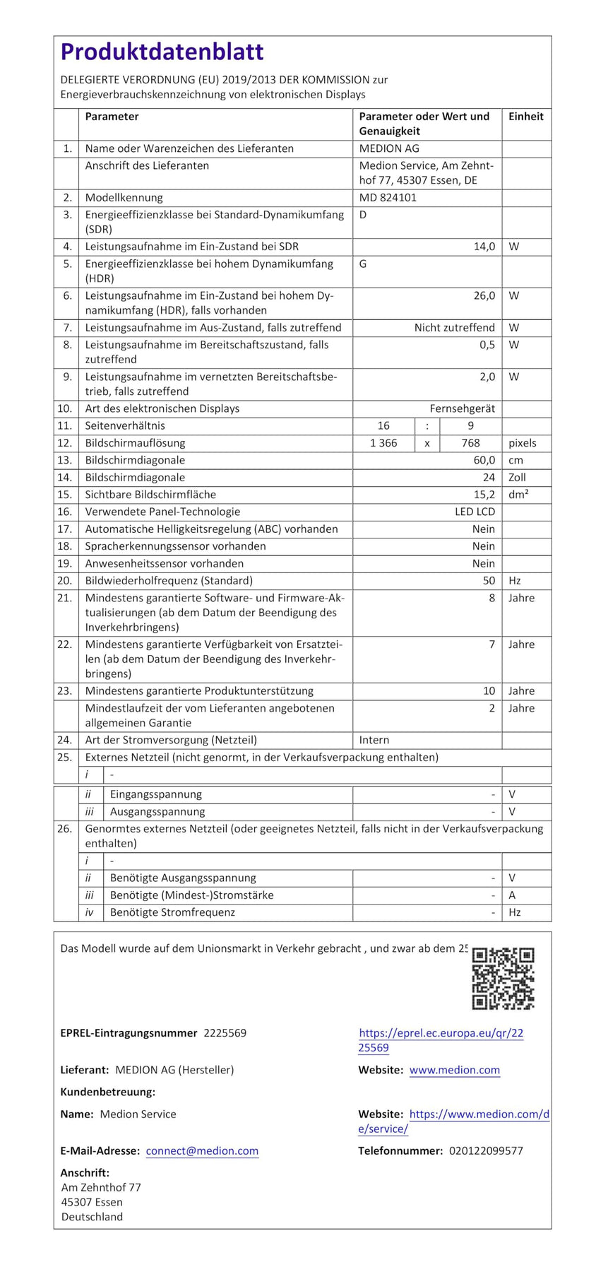 • Lieferumfang: MEDION LIFE P8242501 MD824101 Smart-TV, Standfüße inkl. Schrauben, Fernbedienung inkl. Batterien (AAA), Bedienungsanleitung