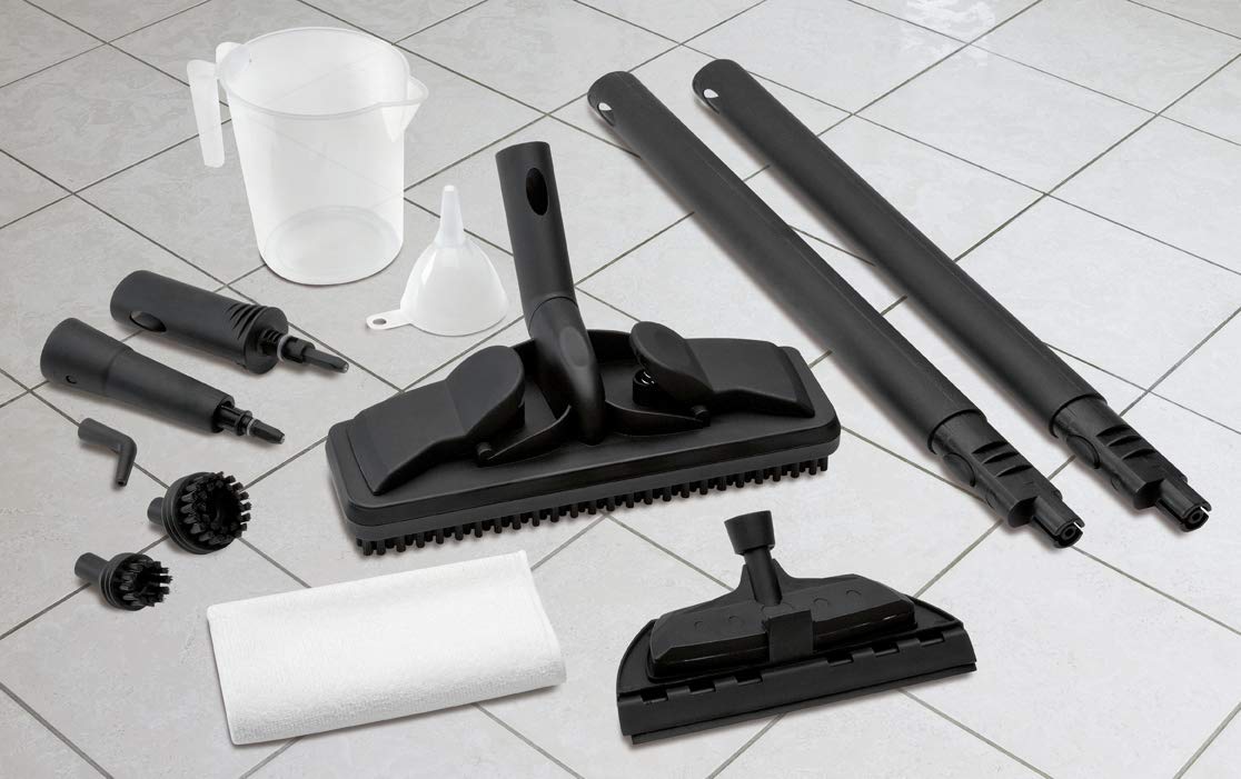 Einzelheiten: ■ Dampfreiniger – reinigt, entfettet und desinfiziert ohne Kalkrückstände und Putzstreifen ■ 4 bar Dampfdruck ■ Wassertank: ca. 1,5 Liter ■ Edelstahlheizkessel ■ Kontrollleuchten (Netz und Betriebsbereitschaft) ■ Sicherheitstankdeckel mit Überdruckventil ■ Überhitzungsschutz ■ Ein-/Ausschalter (spritzwassergeschützt) ■ Praktischer, offener Tragegriff ■ Leichtlaufräder ■ Dampfregelung am Handgriff ■ Inkl. 10-teiligem Zubehör: Verlängerbares Steckrohr (2-teilig), Bodenbürste mit Tuchaufnahme, Vliestuch, Fensterreiniger, 2 Strahldüsenaufsätze, 2 unterschiedlich große Rundbürstenaufsätze, Trichter, Messbecher ■ Integriertes Zubehörfach ■ 220–240 V, 50/60 Hz, 1500 W