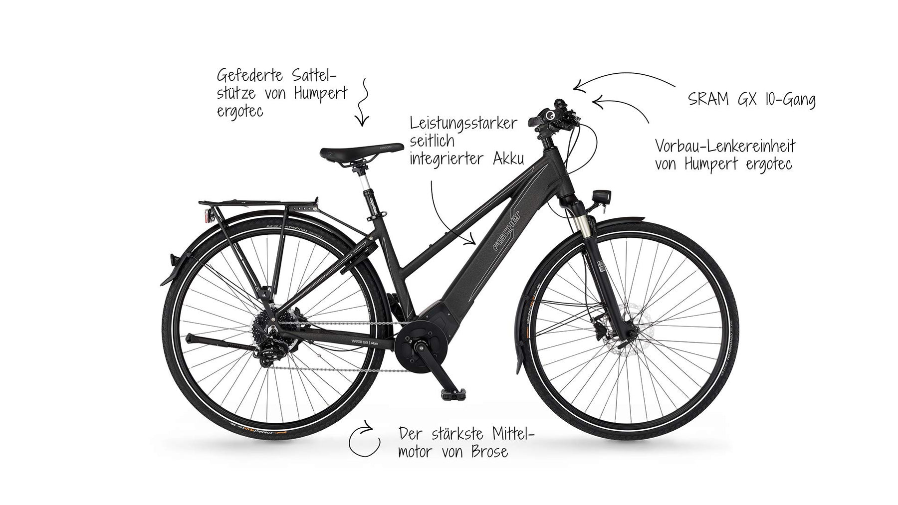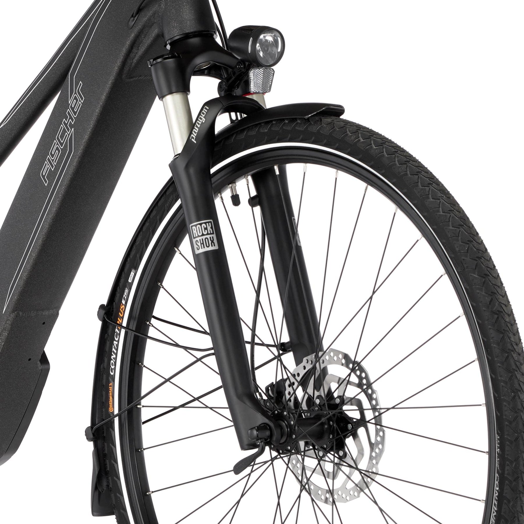 Einzelheiten: Das E-Trekking Premium Modell bringt geballte Kraft und zeitlosen Style auf die Straße. Herzstück ist der Drive S Mittelmotor von Brose. Flüsterleise arbeitet dieser und gibt dem Fahrenden ein maximal natürliches Fahrgefühl. Komfortabel wird die Fahrt durch verbaute Marken-Federungskomponenten. Konnektivität via Bluetooth und eigener E-Connect-App ist onboard. Das Modell ist außerdem für unsere FISCHER Kinderanhänger geprüft.