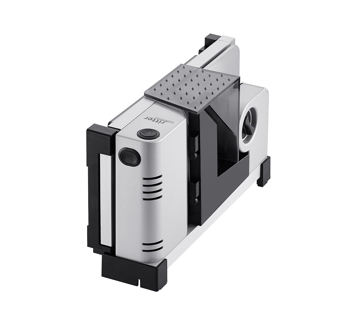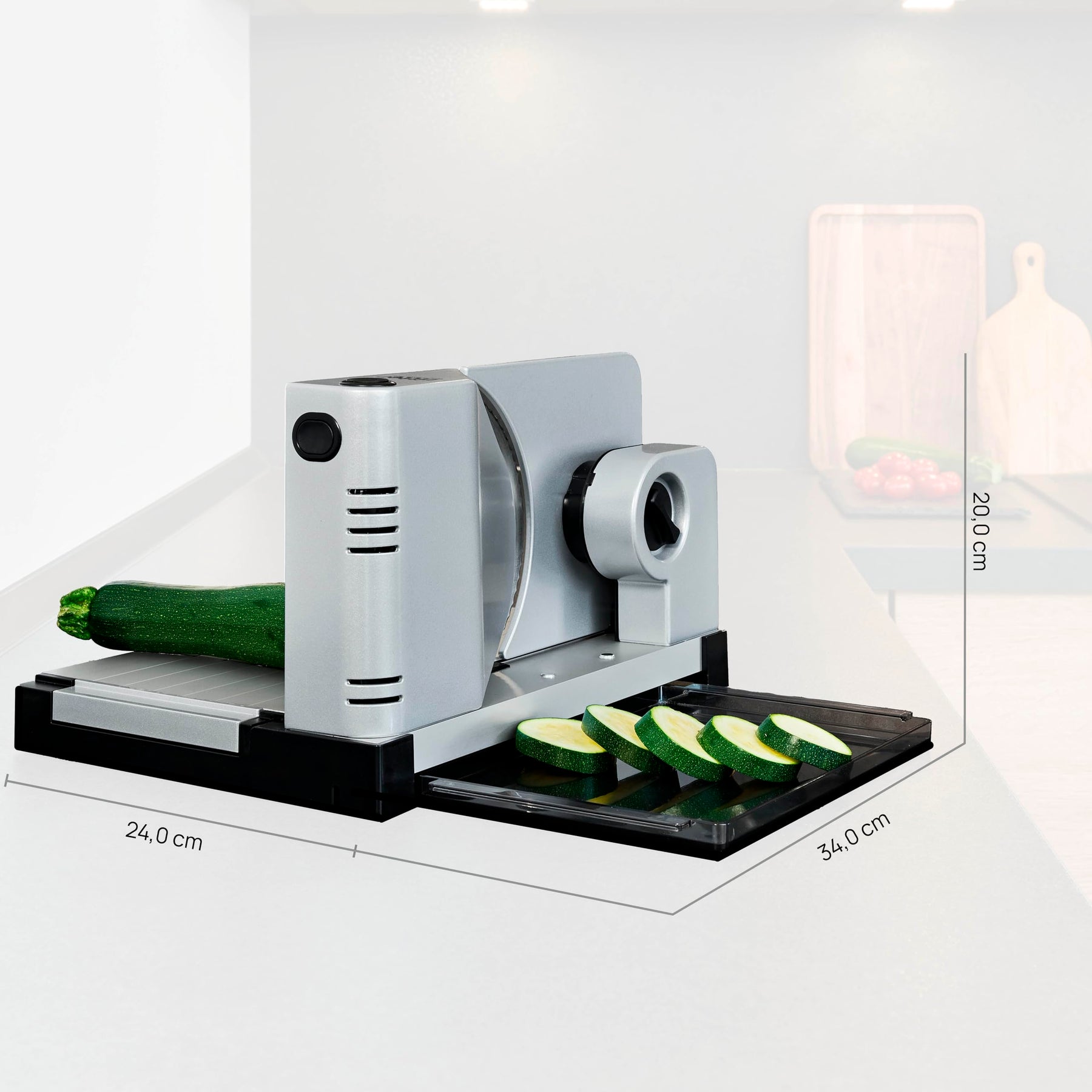 Einzelheiten: ritter Allesschneider icaro 7 silbermetallic Kurzbeschreibung - Vollmetallausführung - Silbermetallic - Klappbarer Auflegetisch - Wellenschliffmesser, 17 cm Ø - Schnittstärkeeinstellung bis ca. 14 mm - Sicherheits-2-Finger-Einschaltsystem - Moment- und Dauerbetrieb - Teilbarer Schlitten zur platzsparenden Aufbewahrung auch am geklappten Gerät - Schlittenweg ca. 20 cm - Schneidgut-Auffangschale - Kabeldepot Technische Daten - 230 Volt - 65 Watt - KB 5 min. - VDE / GS - Schutzklasse 2 - CE - Maße: Breite 24,0 cm (geklappt 10,0 cm) Höhe 20,0 cm Tiefe 34,0 cm - Gewicht: 3,6 kg Lieferumfang - Allesschneider silbermetallic mit Wellenschliffmesser, 17 cm Ø - Schneidgut-Auffangschale - Schneidgutschlitten - Restehalter - Bedienungsanleitung