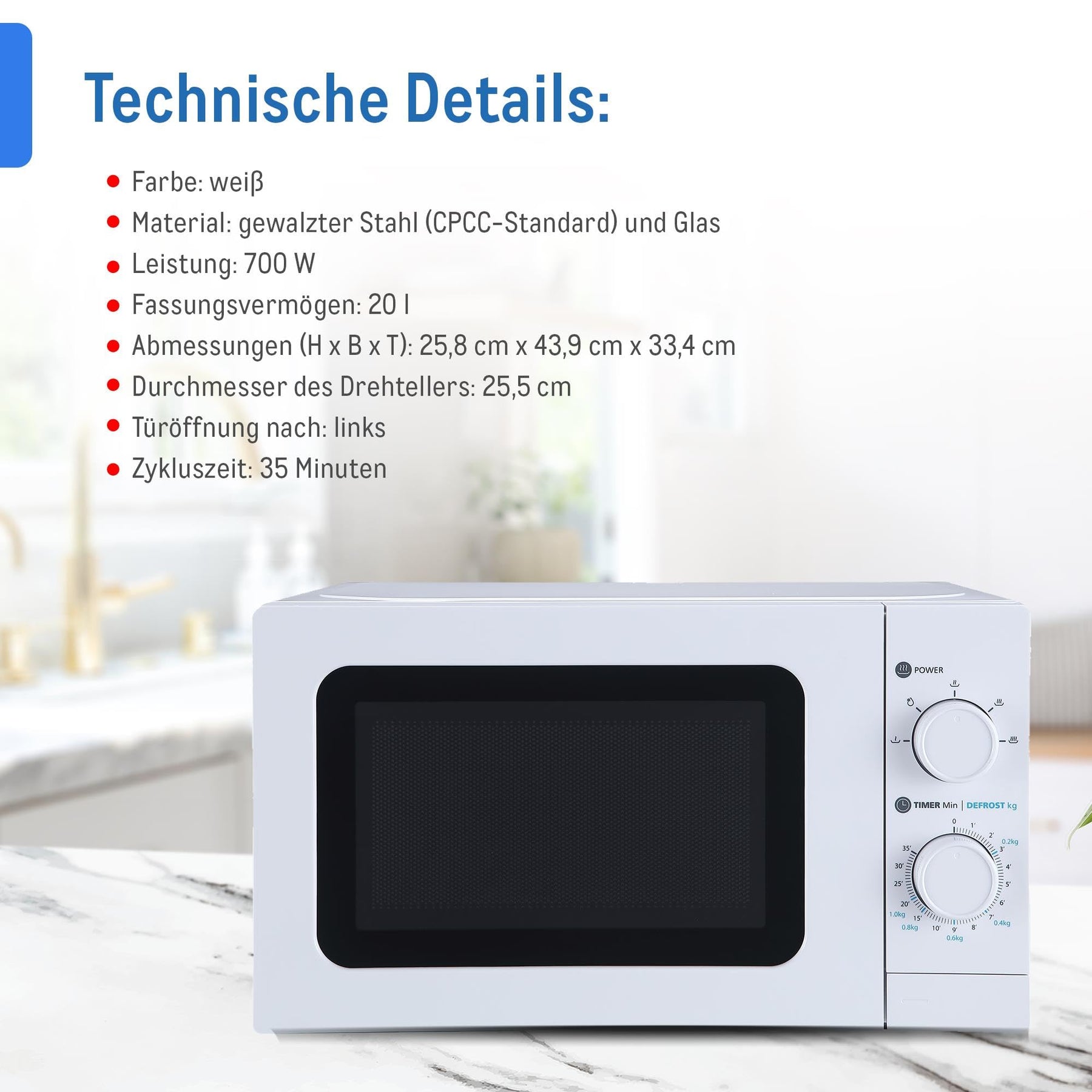 Einzelheiten: "Unser Mikrowellenherd besticht durch seine zahlreichen Funktionen. Er bietet einen Kochraum von bis zu 20 Litern. Dank ihrer freistehenden Bauweise kann die Mikrowelle überall aufgestellt werden und passt dank ihres klassischen Designs in jede Küche, egal in welchem Stil. Um die Mikrowelle zu benutzen, benötigen Sie lediglich einen Stromanschluss. Produktabmessungen (H x B x T): 25.8 cm x 43.9 cm x 33.4 cm Gewicht inkl. Verpackung: 11.17 kg Produktgewicht: 10.15 kg Durchmesser des Drehtellers: 25.5 cm Auftaufunktion: Ja Drehteller (Mikrowelle): Ja Innenbeleuchtung: Ja Akustisches Signal: Ja Anzahl der Leistungsstufen: 5 Innere Kapazität: 20 l"