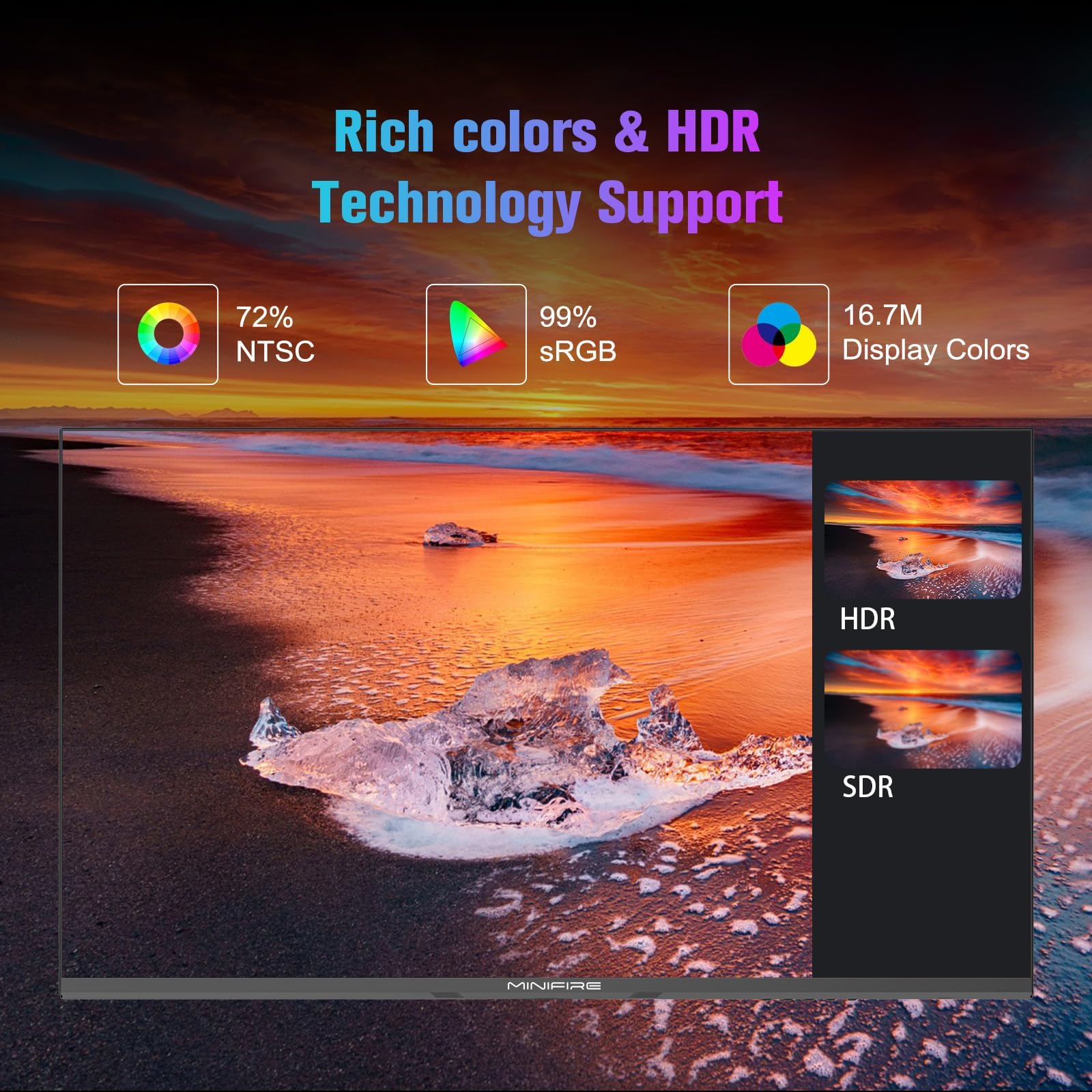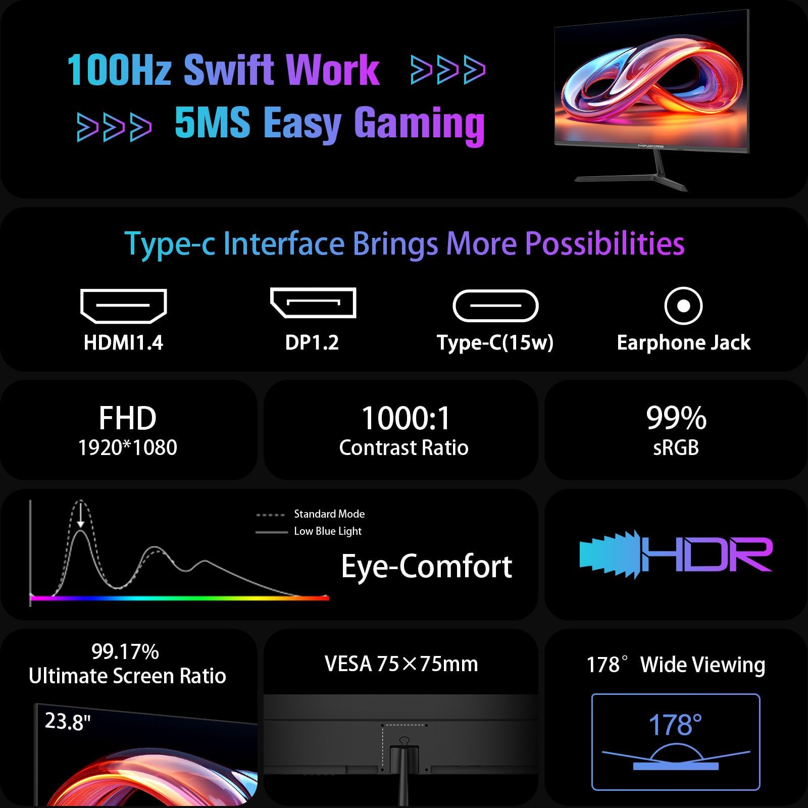 - Empfang: HDMI 1.4 (bis zu 100 Hz Bildwiederholfrequenz) & USB-C (HDMI-Kabel im Lieferumfang enthalten); VESA-Halterung 75 x 75 mm (inklusive HDMI-Kabel).