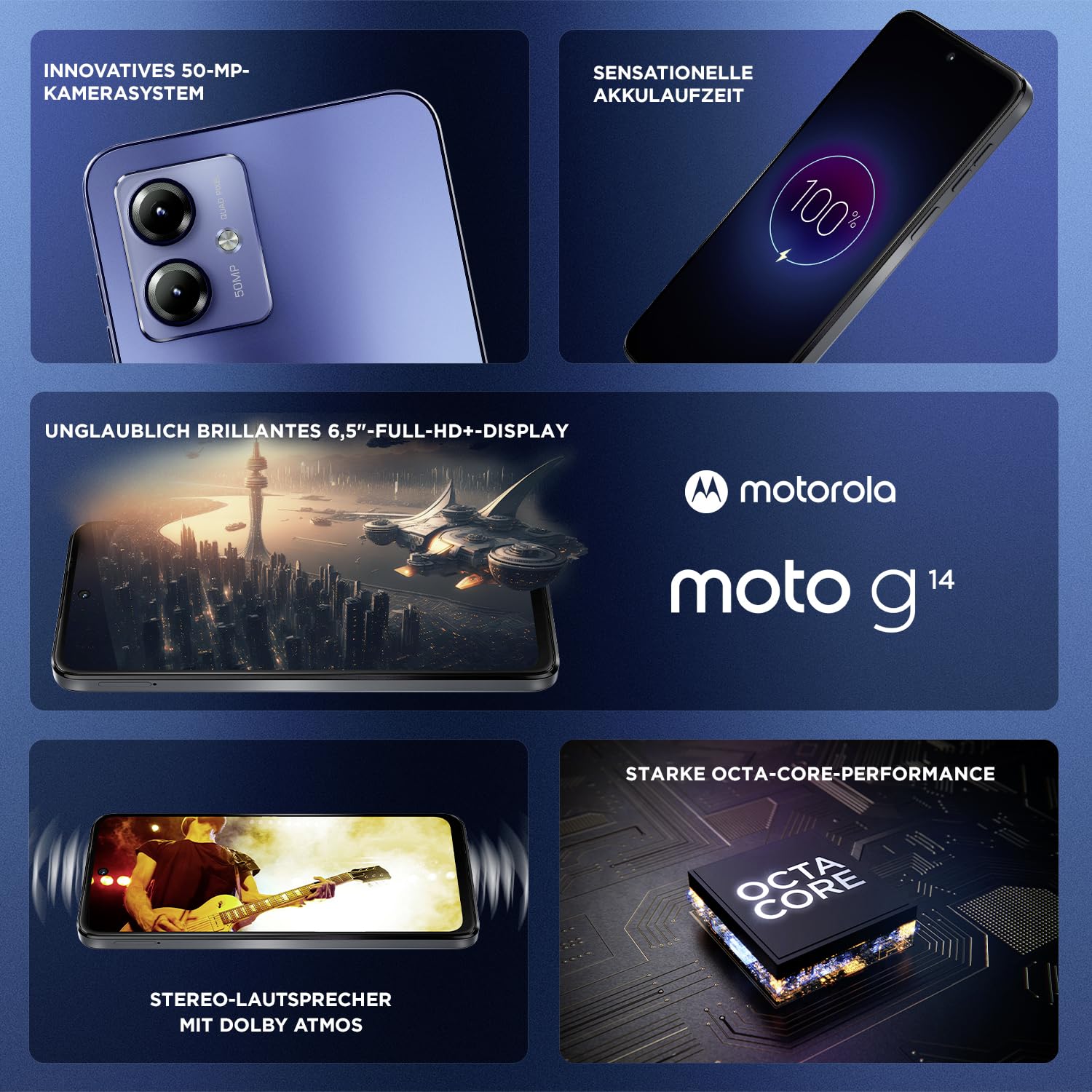 Ein großartiges Display macht für Sie den Unterschied? Dann entdecken Sie das moto g14. Mit seinem unglaublich brillanten 6,5"-Full-HD+-Display erweckt es Filme, Serien, Spiele und Video-Calls gestochen scharf zum Leben. Dasselbe gilt für den Sound und Fotos. Dank Stereo-Lautsprechern und Dolby Atmos hören und spüren Sie den glasklaren Sound aus jeder Richtung. Mit dem innovativen 50-MP-Kamerasystem1 können Sie bei Tag und Nacht wunderschöne, detailreiche Fotos aufnehmen. Das aus hochwertigen Materialien gefertigte moto g14 bietet mit seinem wasserabweisenden Design5 ein edles Look and Feel. Zusammen mit der hervorragenden Akkulaufzeit2, 128 GB internem Speicher3 und der starken Performance des Octa-Core-Prozessors hat das moto g14 alles, was Sie brauchen. (1) Der 50-MP-Sensor verbindet vier Pixel zu einem und liefert damit eine Fotoauflösung von 12,5 MP. (2) Der Akku muss möglichst stark entladen sein. Der Ladevorgang verlangsamt sich mit steigendem Ladezustand. Alle Angaben zur Akkuleistung sind Annäherungswerte, die auf einem durchschnittlichen gemischten Benutzerprofil basieren, das sowohl Nutzungs- als auch Standby-Zeiten unter optimalen Netzbedingungen berücksichtigt. Die tatsächliche Akkuleistung variiert und ist von vielen Faktoren abhängig, dazu zählen Signalstärke, Netzwerkkonfiguration, Alter des Akkus, Betriebstemperatur, ausgewählte Features, Geräteeinstellungen sowie sprach-, daten- und andere anwendungsspezifische Gegebenheiten. (3) Der für den Nutzer verfügbare Speicherplatz ist aufgrund verschiedener Faktoren geringer (u. a. weil Betriebssystem, Software und Funktionen einen Teil des Speicherplatzes belegen) und kann sich ohne Vorankündigung durch Softwareupdates ändern. (4) Unterstützt microSD-Karten mit bis zu 1 TB (microSD-Karten sind separat erhältlich). DRM-eingeschränkte Inhalte können u. U. nicht auf der Karte gespeichert werden. (5) Das wasserabweisende Design schützt das Gerät vor moderatem Kontakt mit Wasser, etwa bei versehentlich verschütteten Getränken, Wasserspritzern oder leichtem Regen. Das Gerät darf nicht in Wasser bzw. andere Flüssigkeiten eingetaucht oder Wasserdruck ausgesetzt werden, da es nicht wasserdicht ist. Die wasserabweisenden Eigenschaften können mit der Zeit nachlassen.