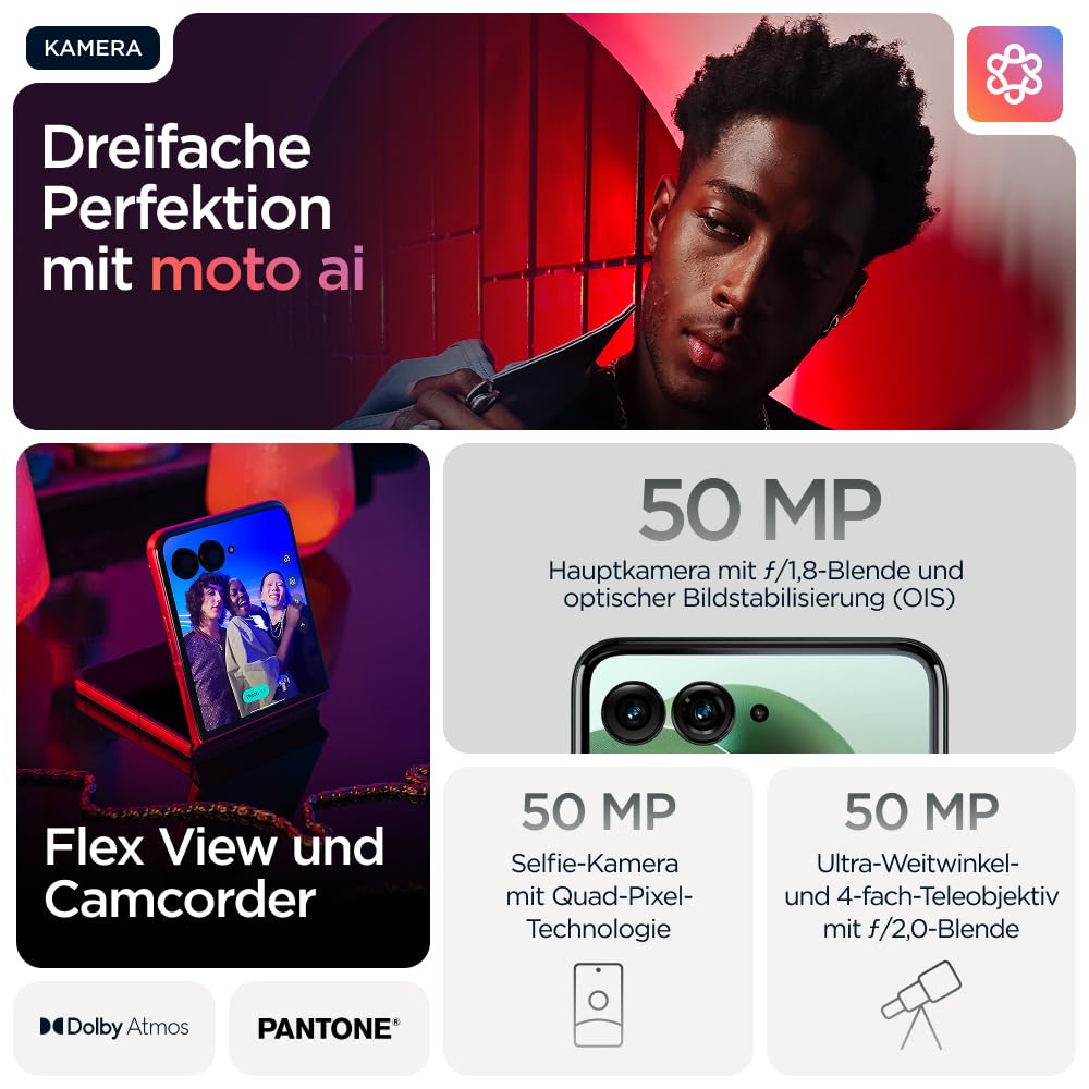 - Das innovativste Flip-Kamerasystem. Nehmen Sie mit dem 50-MP-Kamerasystem mit Moto AI mühelos Fotos und Videos aus jedem möglichen Winkel auf.
