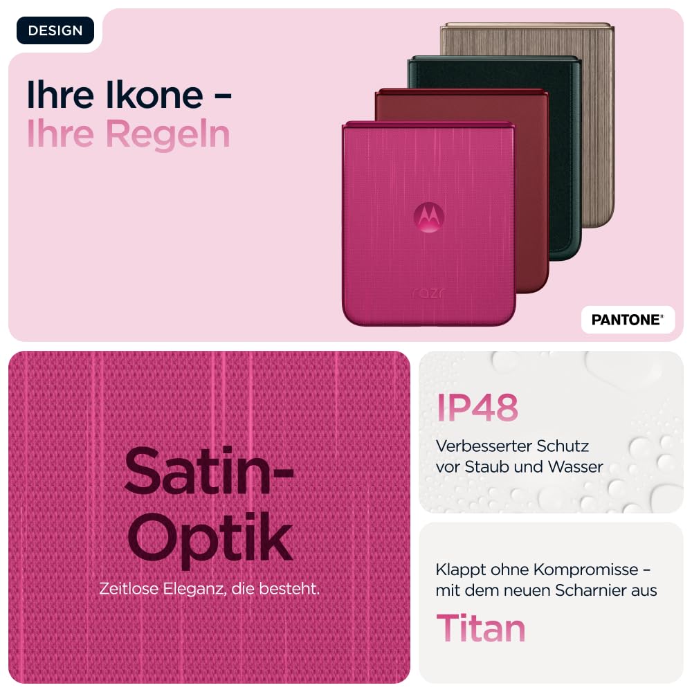 Motorola razr 60 Ultra Flip-Phone (6,96"-pOLED-Display/Robustes 4,0"-Außendisplay mit Gorilla Glass Ceramic, widerstandsfähig, wassergeschützt, 50-MP-Moto-AI-Kamera, 16/512 GB) Pantone Cabaret