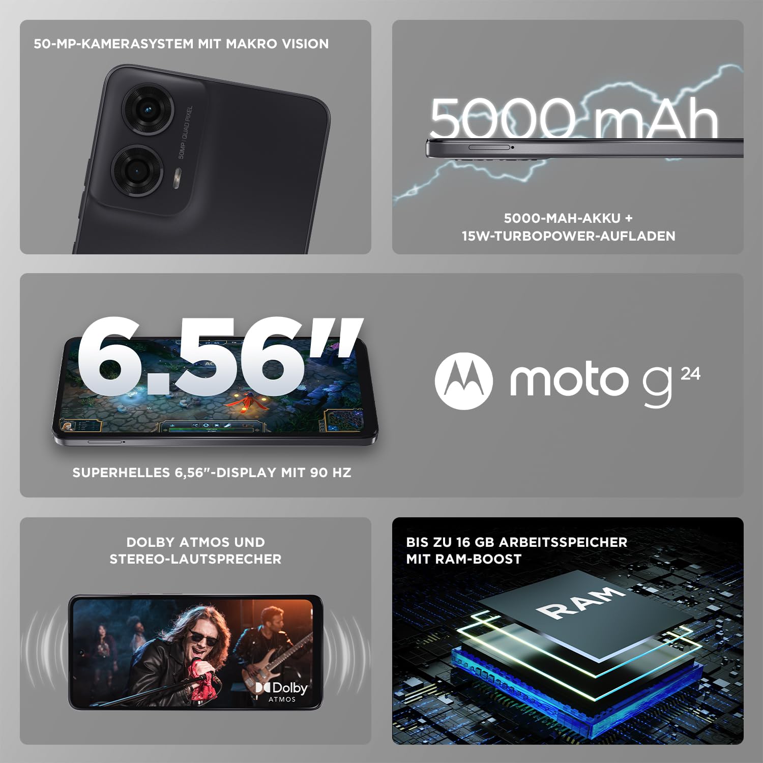 Einzelheiten: Das moto g24 – gemacht für alle, die es schnell und stylisch lieben. Das elegante Smartphone ist aus hochwertigen Materialien gefertigt, verfügt über einen Hochleistungsprozessor und bietet den Geschwindigkeitsschub von RAM-Boost. Dank dem 50-MP-Kamerasystem mit Makro Vision-Objektiv können Sie bei Tag und Nacht wunderschöne, detailreiche Fotos aufnehmen. Genießen Sie Ihr Lieblingsentertainment auf dem 6,56"-Display ohne Notch mit einer schnellen Bildwiederholfrequenz von 90 Hz und einem Modus für starke Helligkeit. Und erleben Sie Dolby Atmos-Sound über Stereo-Lautsprecher. Der starke 5000-mAh-Akku mit 15W-TurboPower-Aufladen liefert Ihnen die Power für Spaß nonstop.