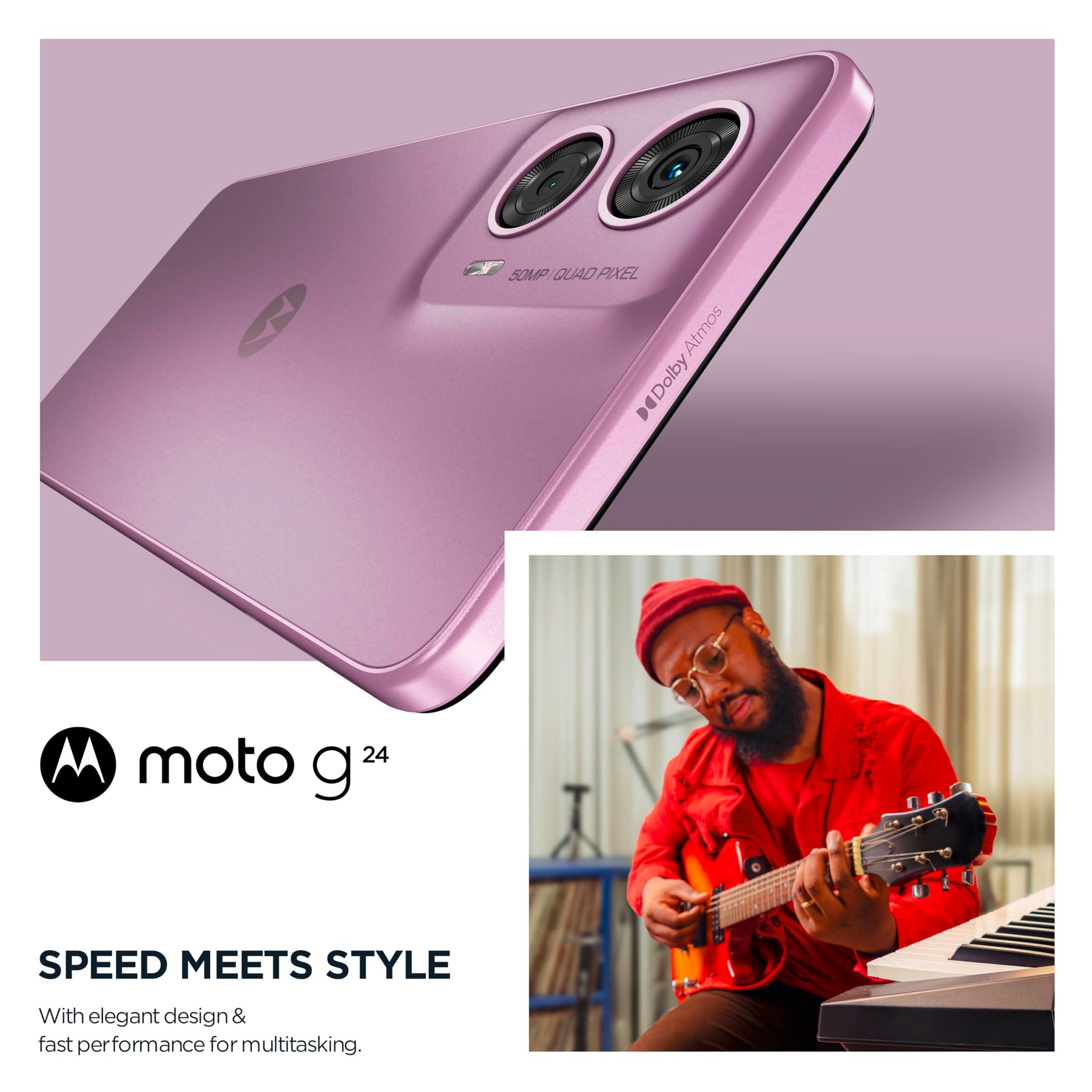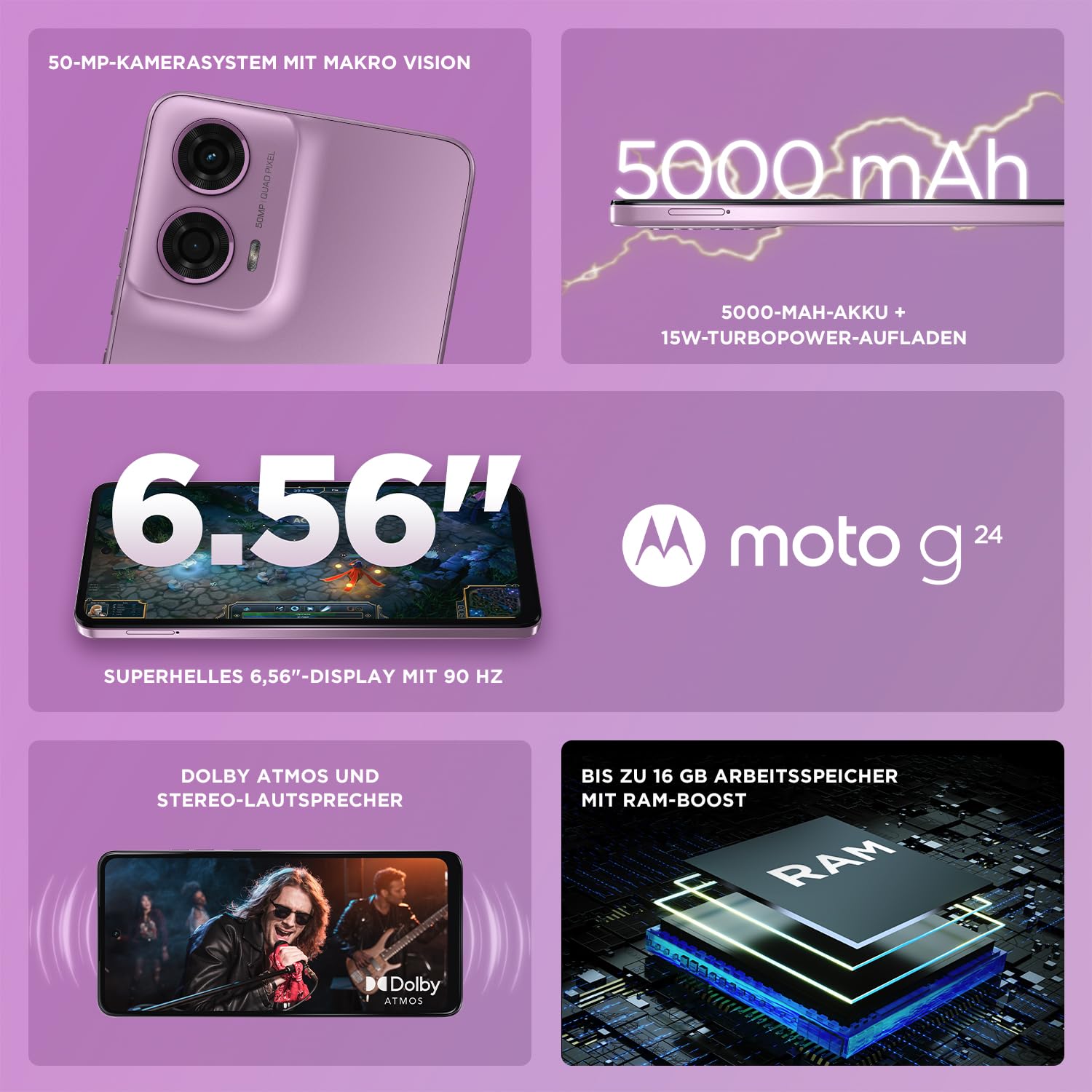 Einzelheiten: Das moto g24 – gemacht für alle, die es schnell und stylisch lieben. Das elegante Smartphone ist aus hochwertigen Materialien gefertigt, verfügt über einen Hochleistungsprozessor und bietet den Geschwindigkeitsschub von RAM-Boost. Dank dem 50-MP-Kamerasystem mit Makro Vision-Objektiv können Sie bei Tag und Nacht wunderschöne, detailreiche Fotos aufnehmen. Genießen Sie Ihr Lieblingsentertainment auf dem 6,56"-Display ohne Notch mit einer schnellen Bildwiederholfrequenz von 90 Hz und einem Modus für starke Helligkeit. Und erleben Sie Dolby Atmos-Sound über Stereo-Lautsprecher. Der starke 5000-mAh-Akku mit 15W-TurboPower-Aufladen liefert Ihnen die Power für Spaß nonstop.