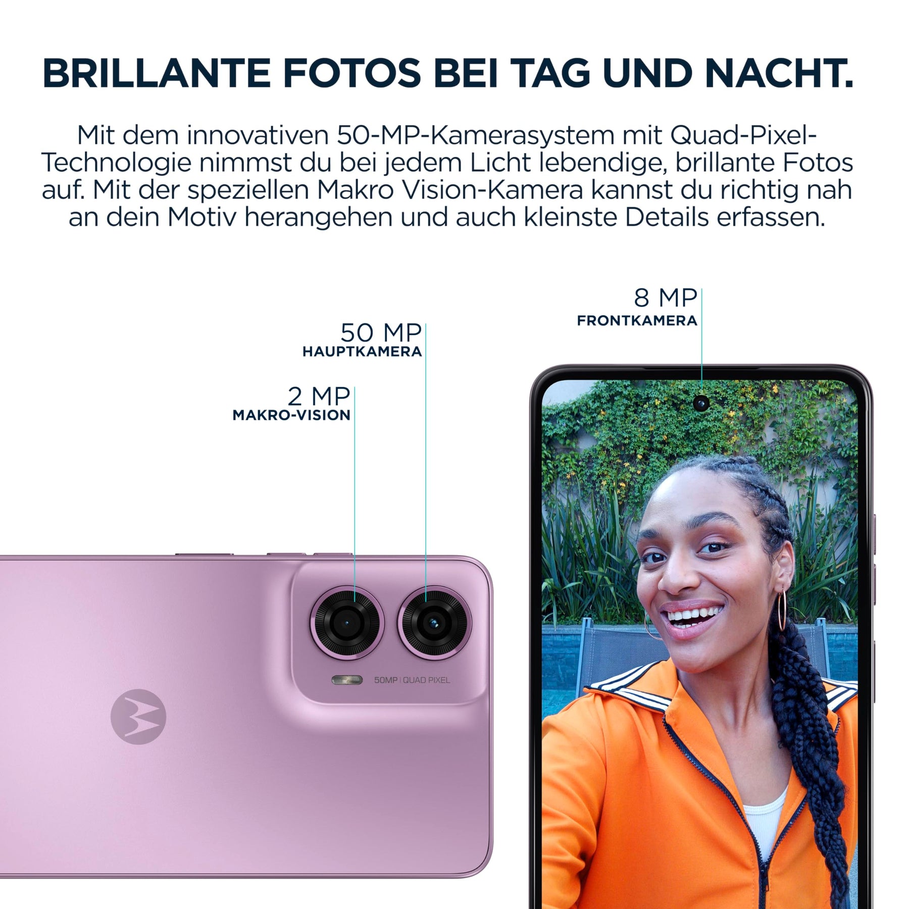 - 50-MP-KAMERASYSTEM MIT MAKRO VISION. Nehmen Sie bei Tag und Nacht brillante Fotos auf und fangen Sie mit dem speziellen Makro Vision-Objektiv selbst kleinste Details aus nächster Nähe ein.
