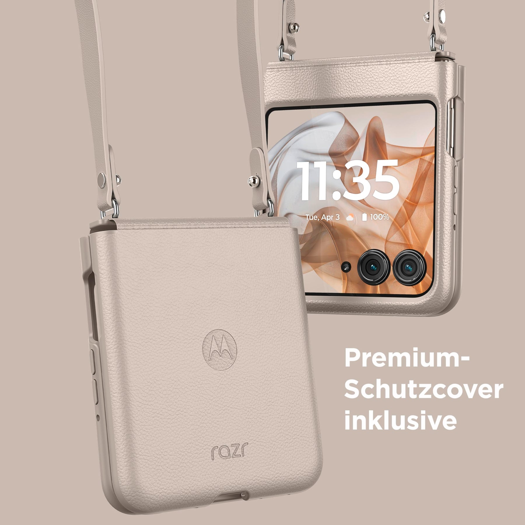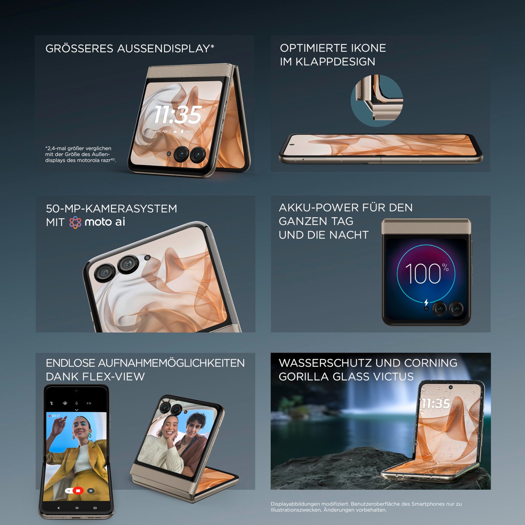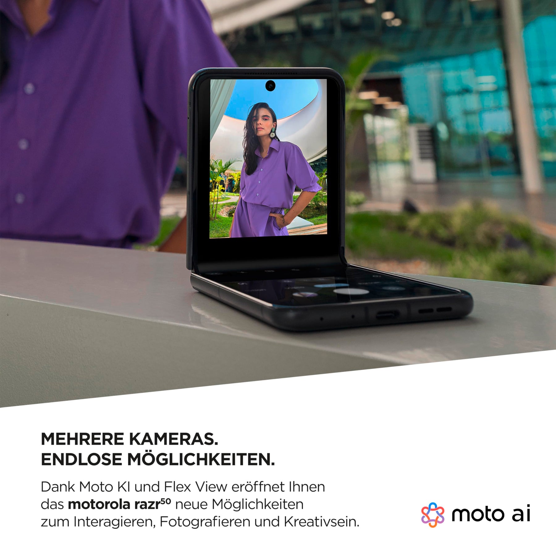 Einzelheiten: Das motorola razr50 – jetzt mit einem großen, vollwertigen Außendisplay. Auf dem funktionalen 3,6"-Display haben Sie mehr im Blick und können mehr machen, ohne das Flip-Phone aufklappen zu müssen. Dank Moto KI und Flex View eröffnet es Ihnen neue Möglichkeiten zum Interagieren, Fotografieren und Kreativsein. Halten Sie das Smartphone ganz normal wie einen Camcorder und nehmen Sie mit dem 50-MP-Kamerasystem dank Moto KI-Bildstabilisierung unterwegs Videos ohne Wackler auf. Oder klappen Sie es auf und erleben Sie das ultrabreite, brillante 6,9"-pOLED-Display. Genießen Sie den mehrdimensionalen Sound von Dolby Atmos. Und lassen Sie sich außerdem begeistern vom robusten Design, dem Finish aus veganem Kunstleder, Wasserschutz und Corning Gorilla Glass Victus. Mit dem motorola razr50 klappt einfach alles.