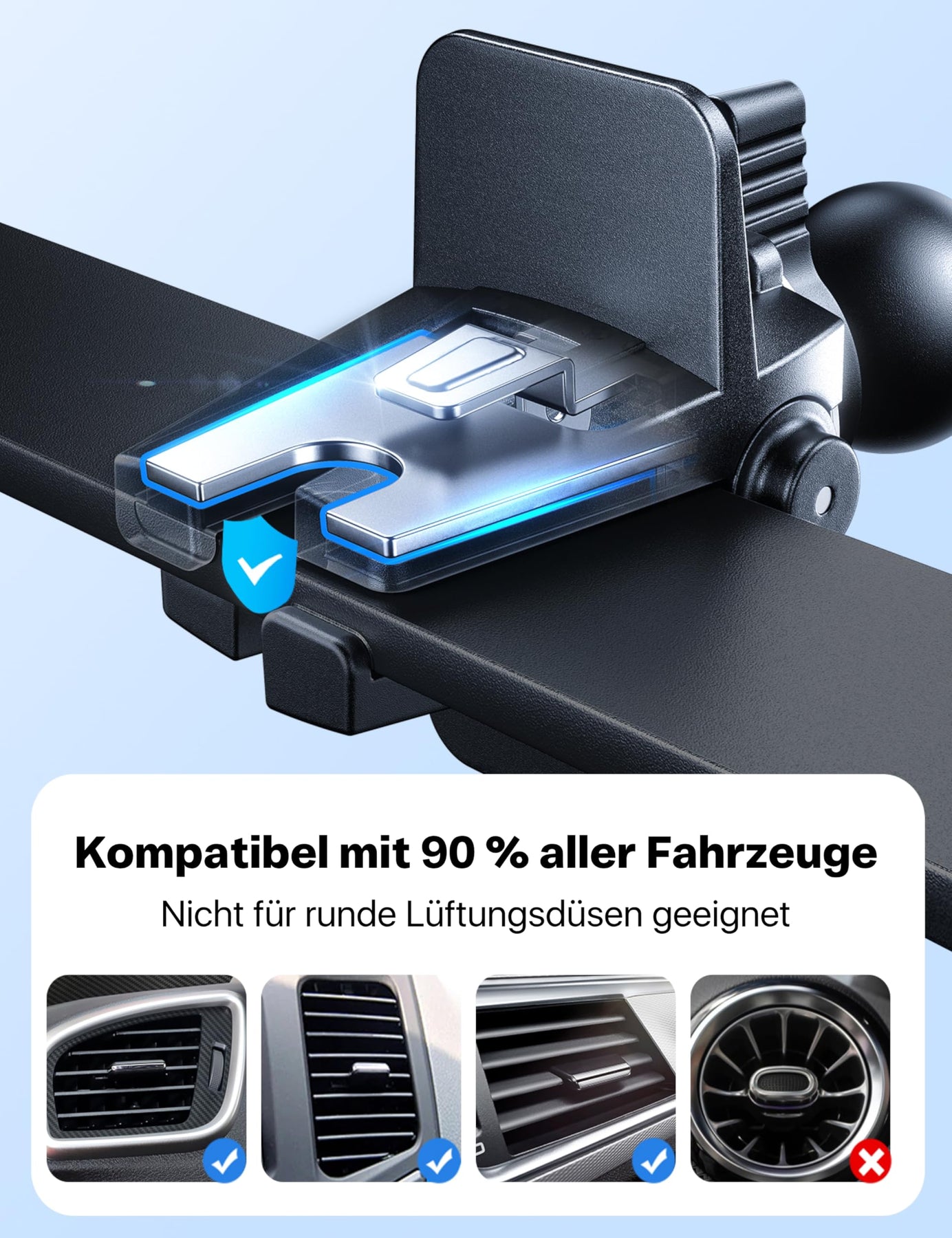 • 【Upgrade Lüftungsklammer – felsenfester Halt】Upgrade handyhalterung auto lüftung wurde speziell für sicheren und stabilen Einsatz im Auto entwickelt. Die Innenseite der Klammer ist vollständig mit weichem Silikon ausgekleidet, das sich eng an die Lüftungslamellen anschmiegt, Kratzer verhindert und gleichzeitig die Reibungskraft deutlich erhöht. Dank Doppel-Sperrstruktur mit integriertem Metallkern und verlängertem Klammerarm bleibt die Halterung selbst auf unebenen Landstraßen oder bei schnellen Autobahnfahrten stabil wie ein Fels. Diese Handyhalter auto ist für horizontale Lüftungsgitter konzipiert und hält Ihr Smartphone stets sicher und stabil. (Nicht für runde Lüftungsauslässe geeignet)