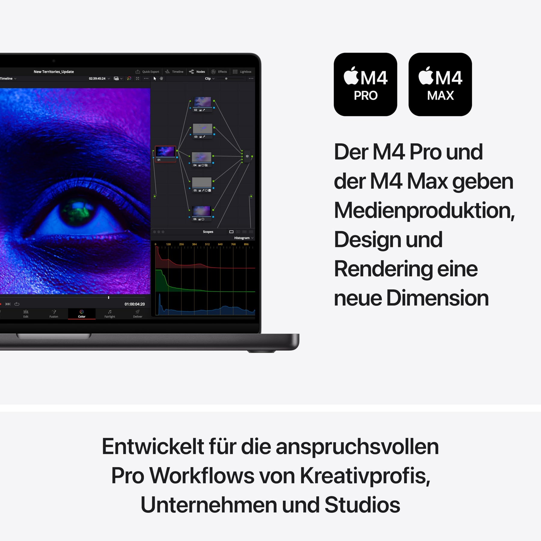 - WARUM EIN 16" MACBOOK PRO MIT M4 PRO ODER M4 MAX – Bahnbrechende Batterie- und Grafikperformance und ein brillantes Liquid Retina XDR Display mit bis zu 1600 Nits Helligkeit – das 16" MacBook Pro mit M4 Pro oder M4 Max erledigt alles in unglaublichem Tempo.
