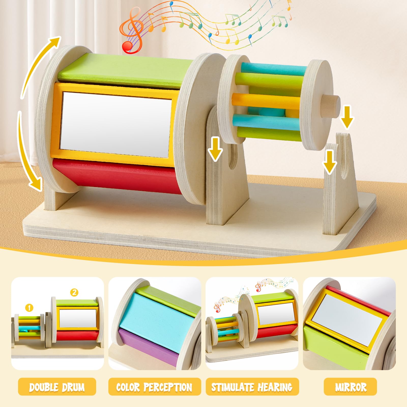 - 🌈 SPINNING DRUM FÜR BABY: Diese 2-in-1 spinning drum einen regenbogen und einen spiegel sowie eine sich drehende trommelrassel, die geräusche macht und die aufmerksamkeit ihres babys auf sich zieht. Die leuchtenden farben und die geräusche ziehen das baby an, während es die spinning drum erkundet, und die sanfte drehbewegung trainiert die arm- und handgelenksmuskulatur. Während sich die trommel dreht, sieht das baby schöne farben und hört beruhigende klänge, die seine sensorische entwicklung anregen.