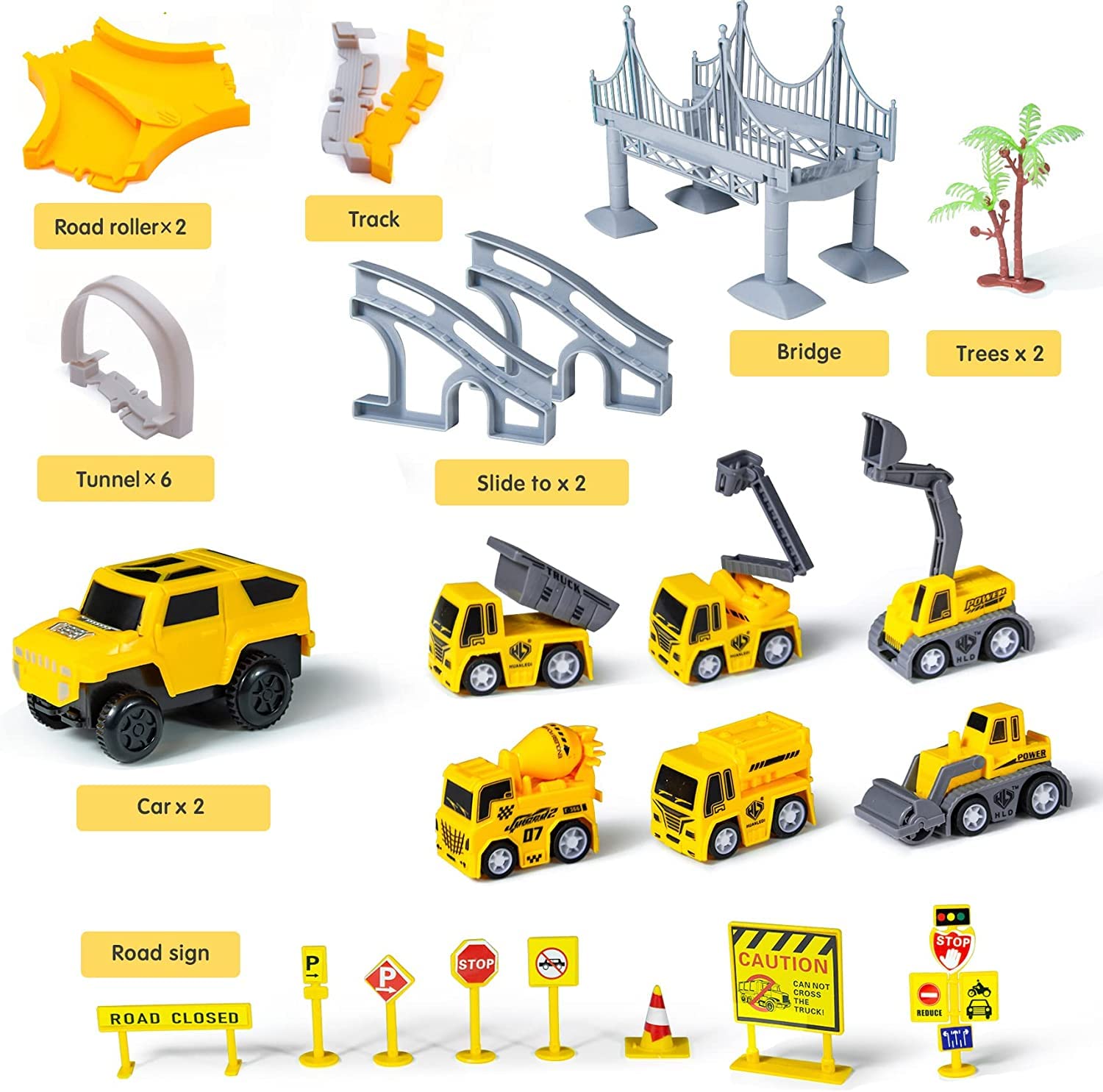 - 【Paket Enthalten】2 Elektrowagen (ohne Batterie), 6 Trägheitsfahrzeuge (Straßenwalzen, Bulldozer, Bagger, Muldenkipper, Arbeitsbühnen, Bewässerungsfahrzeuge),Schienenstück, viadukt,Bogenbrücken,Tunnel,Y-schiene, Baum,Verkehrszeichen zu entfernen. Elektrofahrzeuge können alleine oder manuell mit anderen Trägheitsfahrzeugen auf der Strecke fahren.Die Schiene ist flexibel, sodass Kind sich drehen, drehen und anpassen kann.Erweiterte Konfiguration zum Aufbau Ihres eigenen Baureichs für Ihre Kleinen!