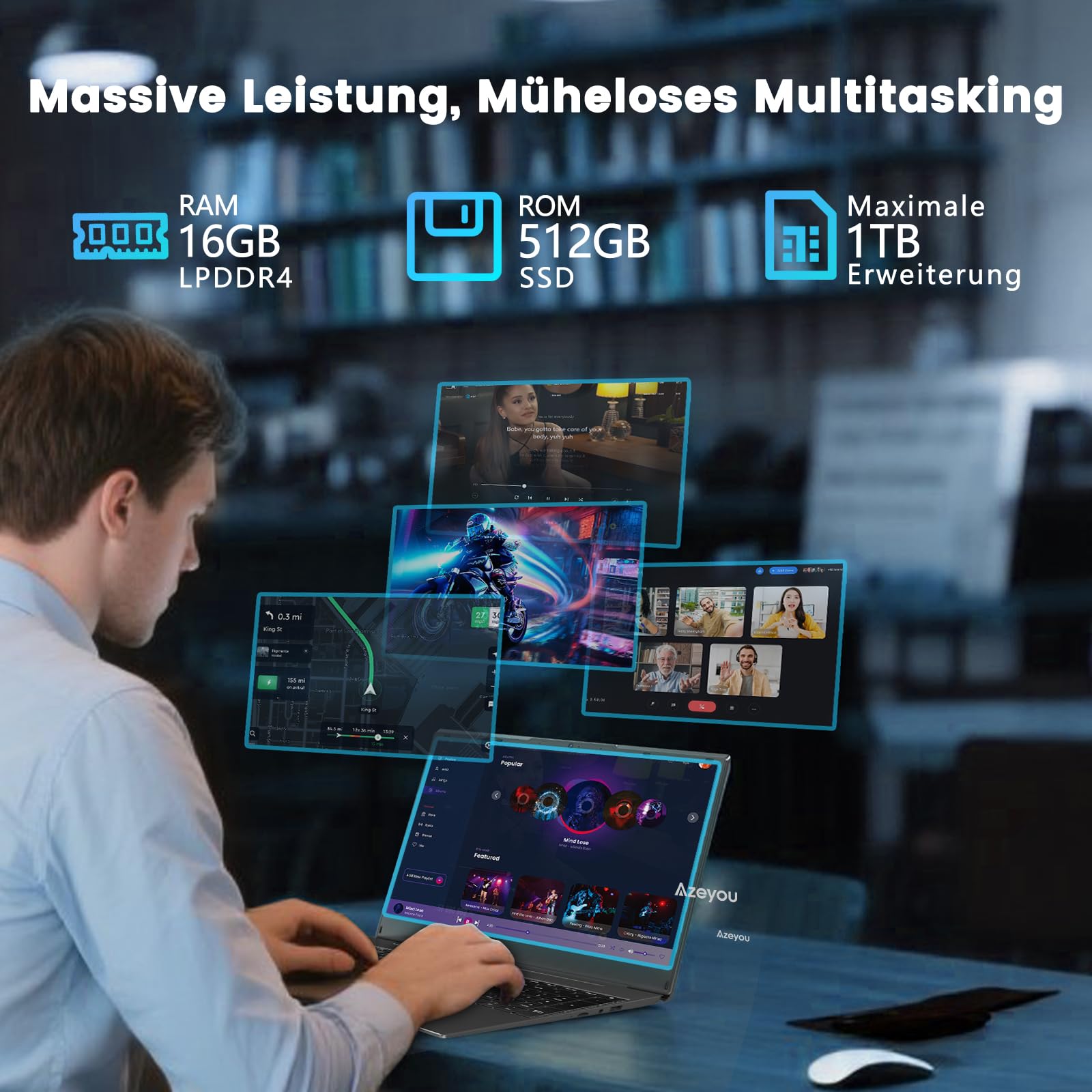 - 【Leicht & Ausdauernd】 Für ein mobiles Leben entwickelt: Der Azeyou N15A Laptop überzeugt mit einem schlanken Profil von nur 19,8 mm und einem Gewicht von 1,75 kg. Der 4500 mAh Akku liefert zuverlässige Energie für stundenlanges Arbeiten, Streaming oder Reisen.