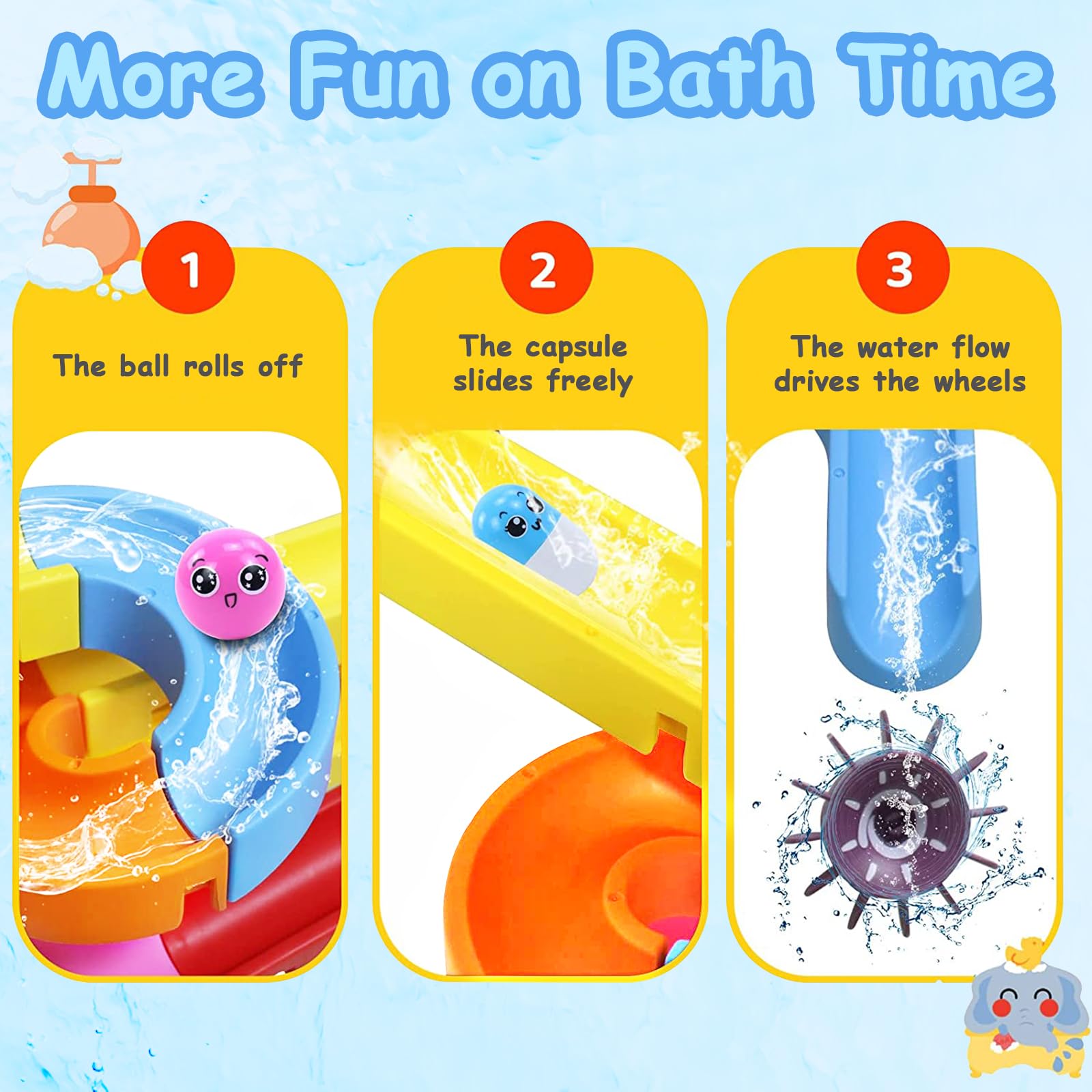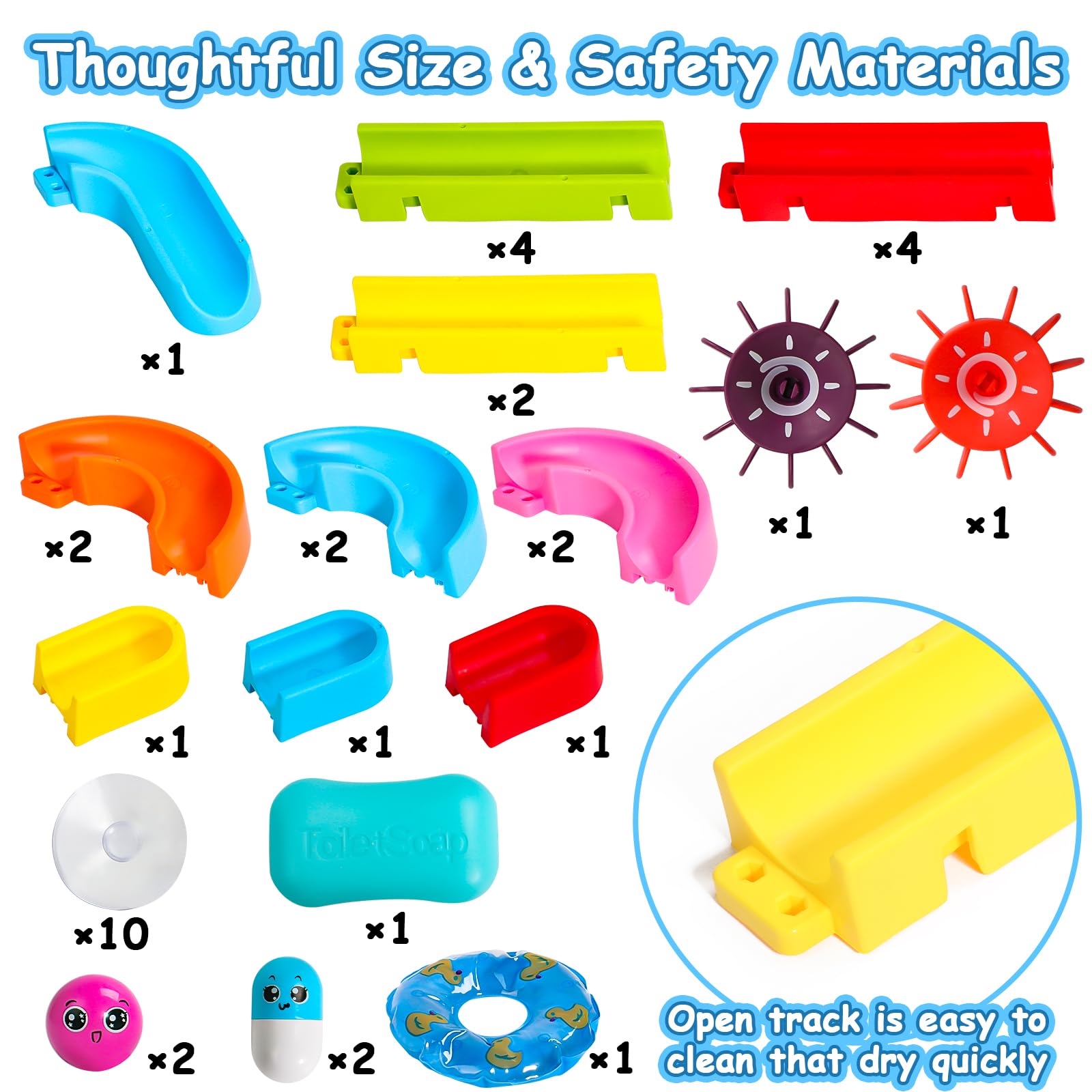 • ❤38 STÜCKE BADESPIEL- Badespielzeug enthält insgesamt 38 Teile, Kinder können verschiedene Badespuren basteln und dann zusehen, wie der Ball fließt und das Hydraulikrad sich dreht, was den Spaß der Kinder beim Baden erhöht.