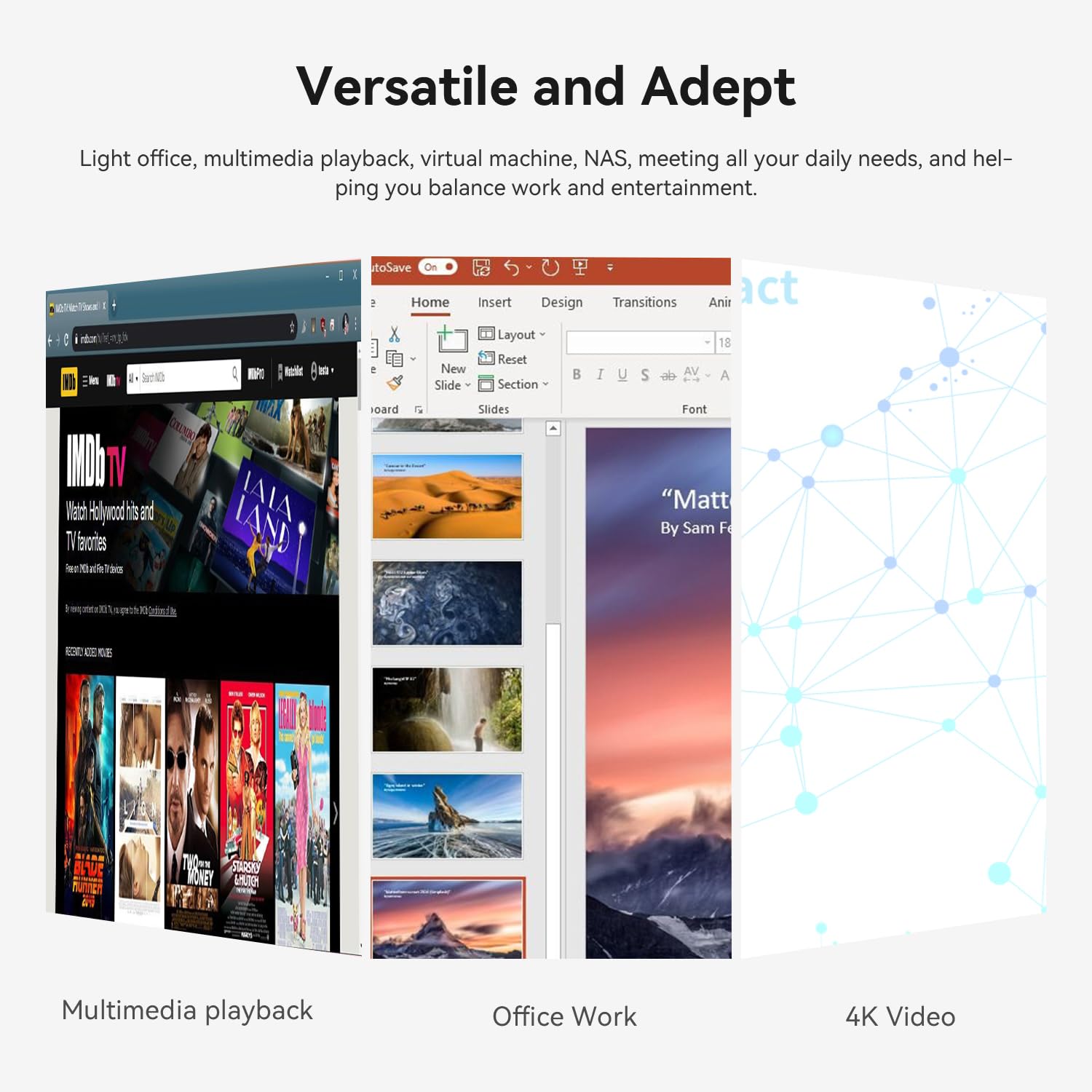 • 🚀【16G DDR4 + 1TB M.2 SSD】 Der EQ14 N150 Mini Desktop PC verfügt über einen integrierten Single-Channel 16GB DDR4 3200MHz, 1TB M.2 SSD. Zwei M.2 PCle 3.0 SSD Steckplätze unterstützen die Erweiterung auf bis zu 4TB.