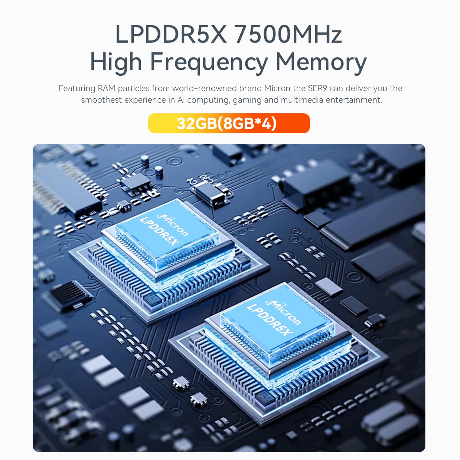 • 🔥【Große Speicherkapazität & Leise】Der AI Mini PC kommt mit 32GB (8GB x4) LPDDR5X 7500MHz Hochfrequenzspeicher, der Ihnen die reibungsloseste Erfahrung im KI-Computing liefern kann. Es gibt auch Dual M.2 PCle 4.0 x4 SSD-Steckplätze unter der Haube, die bis zu 8TB schnellen internen Speicher unterstützen. Das SER9 arbeitet mit einem Geräuschpegel von nur 32 dB, sodass Sie ungestörtes Gaming in Ruhe genießen können.