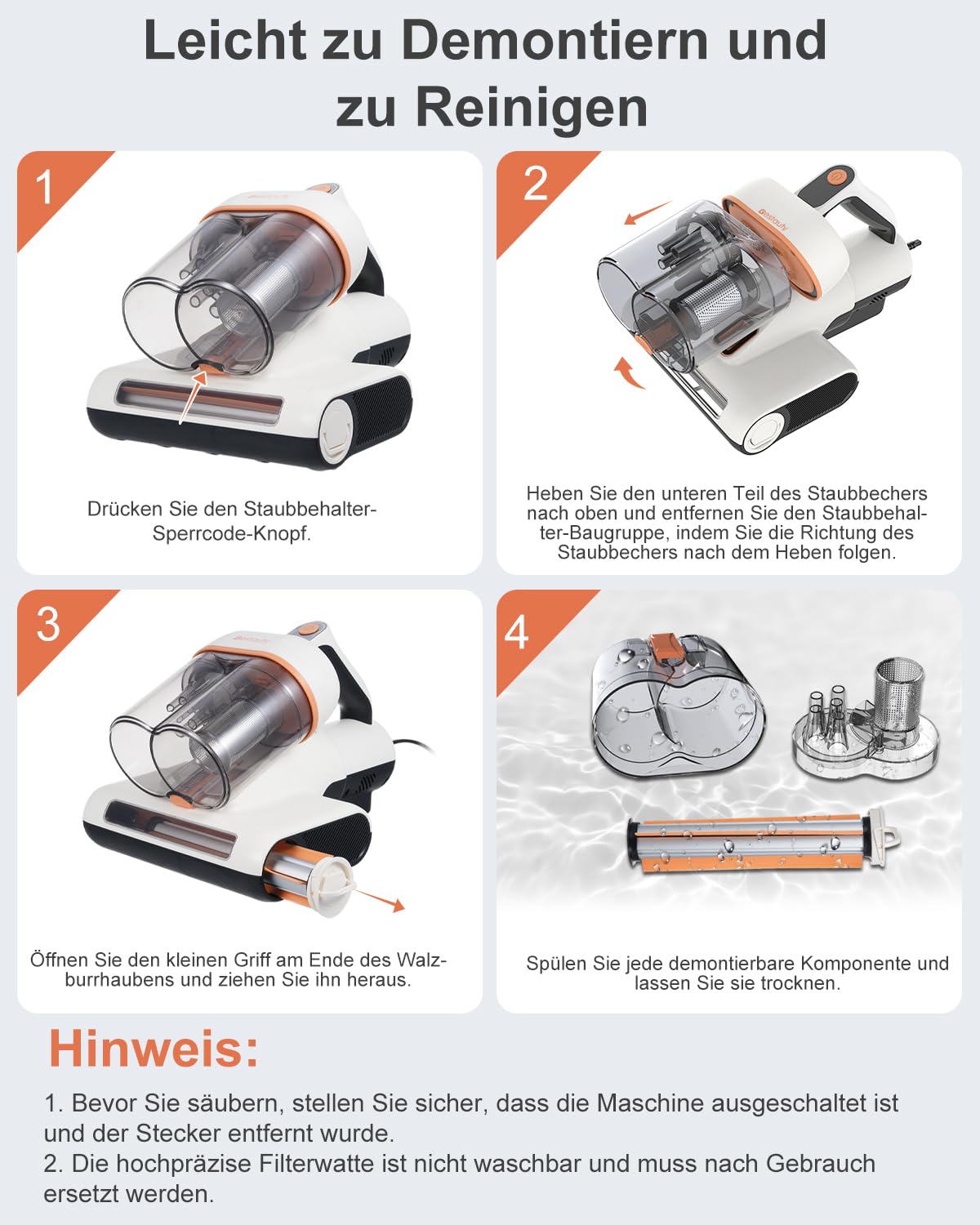 - Leicht zu tragen und wartungsfreundlich: Bestauty CY203 Milbensauger wiegt nur 1,65 Kilogramm und sein leichtes Design ermöglicht es Ihnen, ihn einfach bei der täglichen Reinigung zu transportieren. Gleichzeitig ist das Produkt einfach zu demontieren und zu reinigen, um die Hygiene des Geräts und seine langfristige Nutzungsfähigkeit zu gewährleisten, was Ihre Hausreinigungsarbeiten effizienter und einfacher macht.