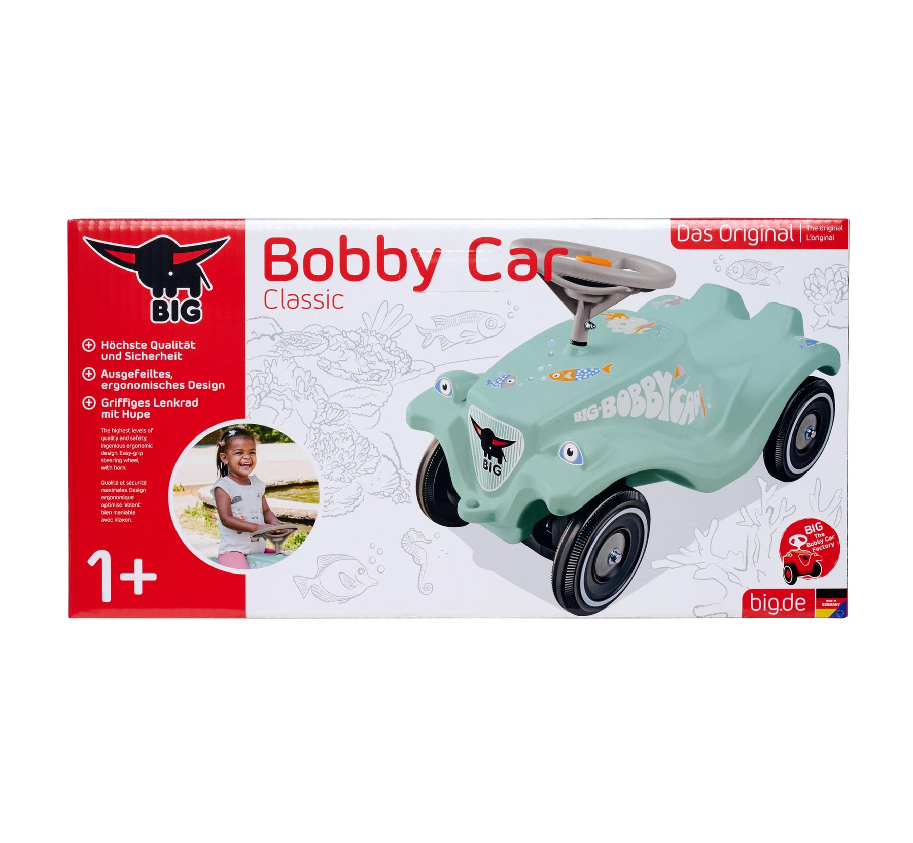 • Farbenfrohes Unterwasser-Auto - Seit über 50 Jahren erkunden Mädchen & Jungen auf dem berühmten BIG Bobby-Car die Welt - jetzt neu im Meerestier-Look mit orangener Hupe & vielen bunten Aufklebern.