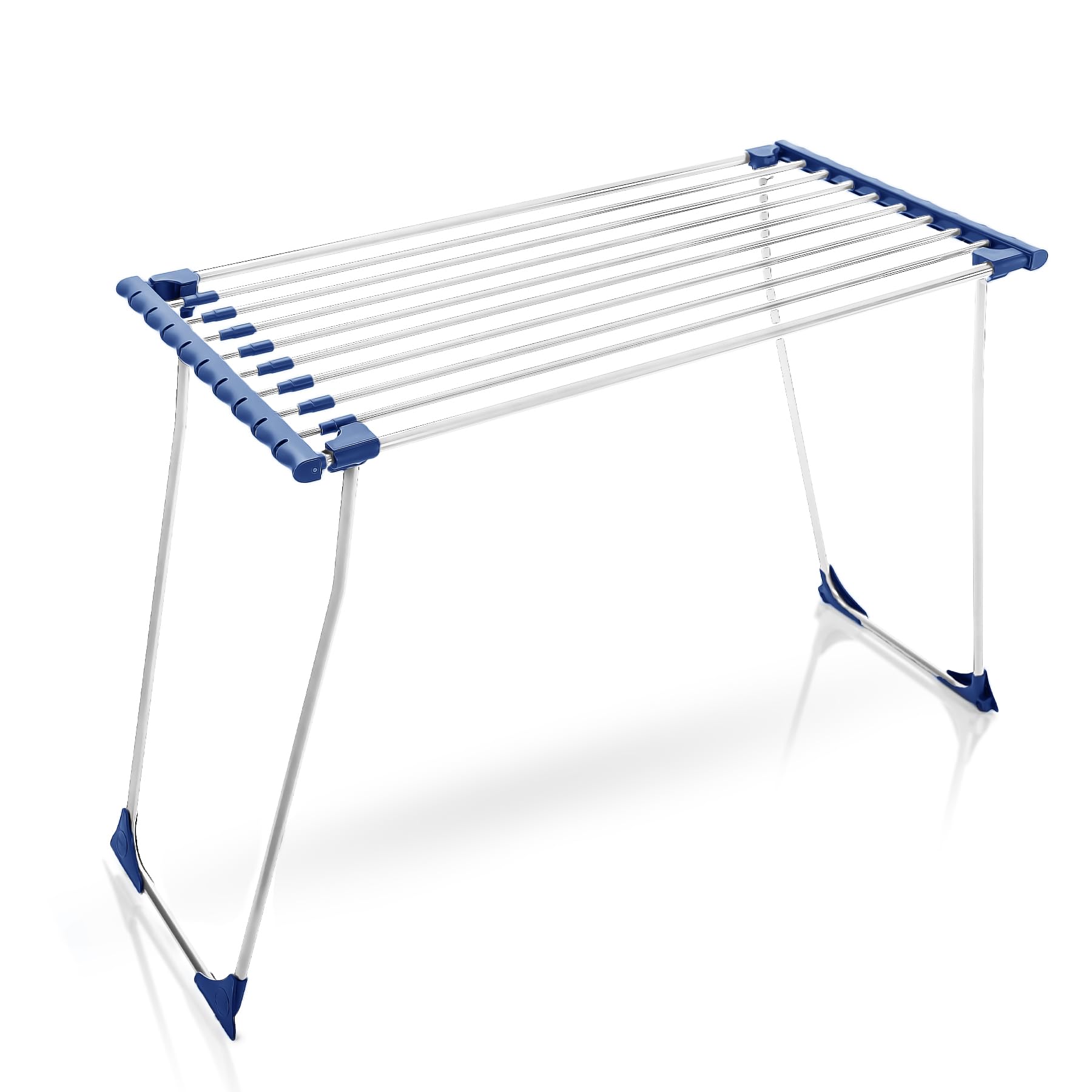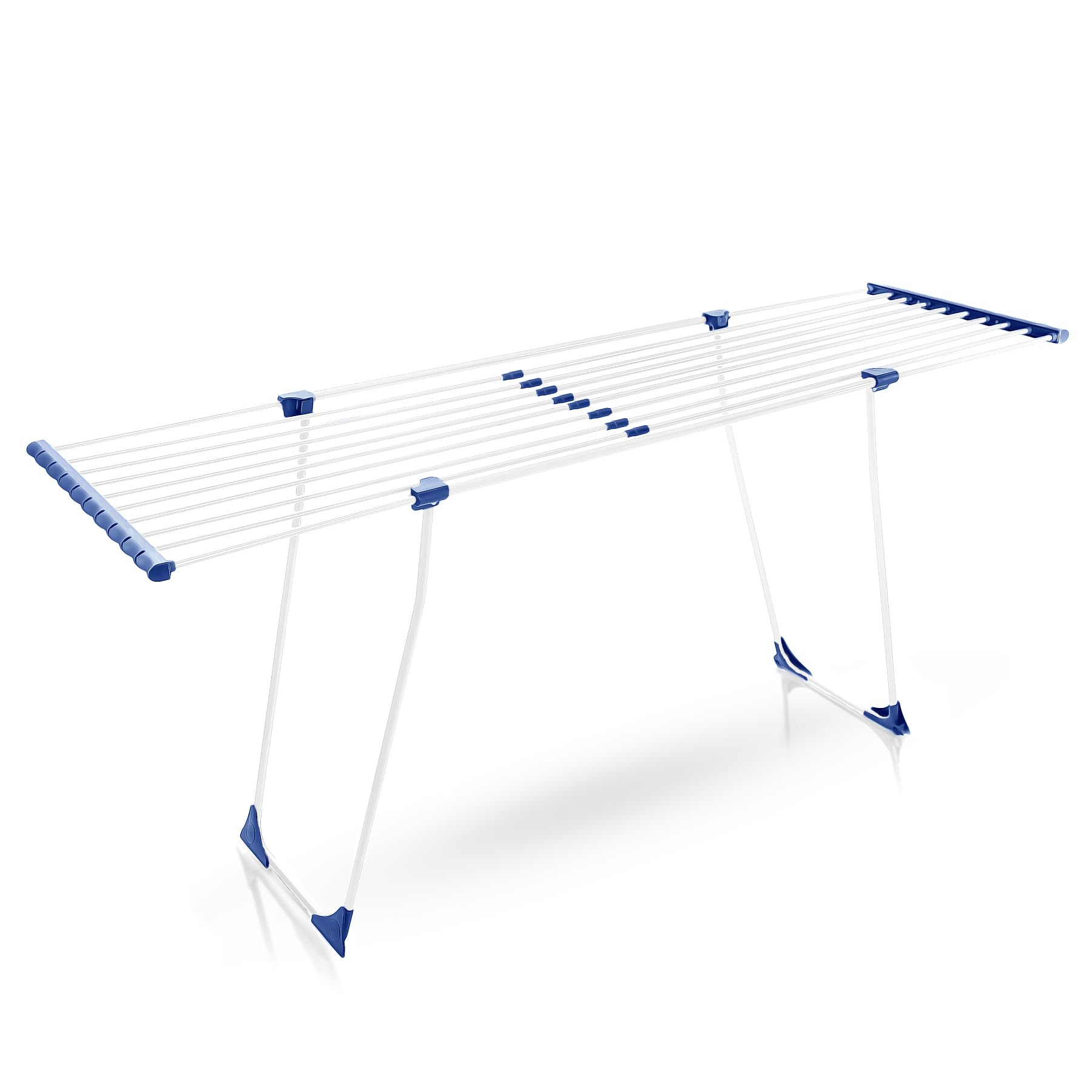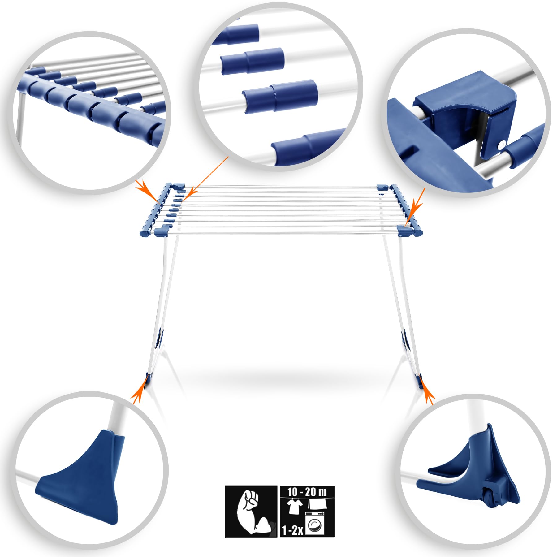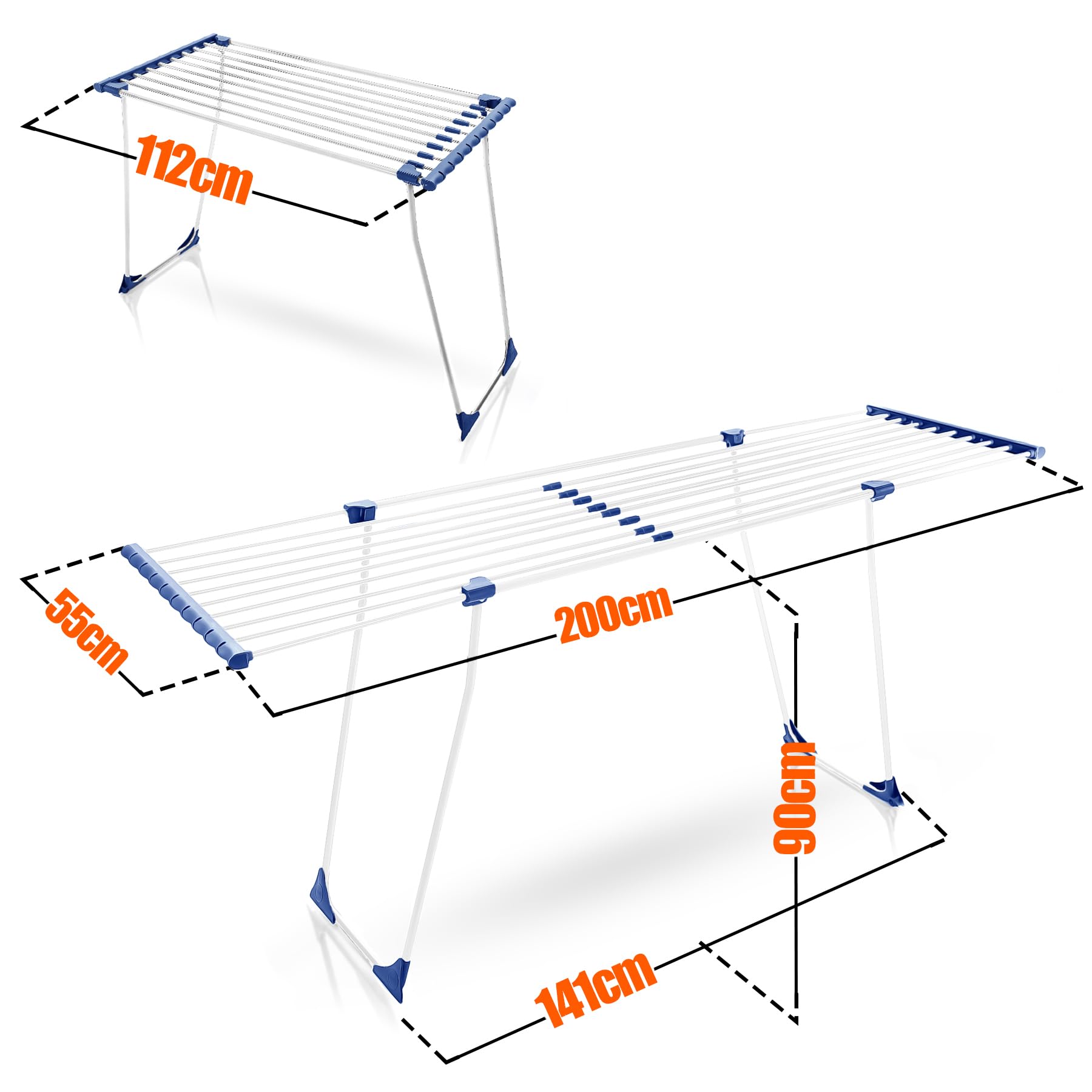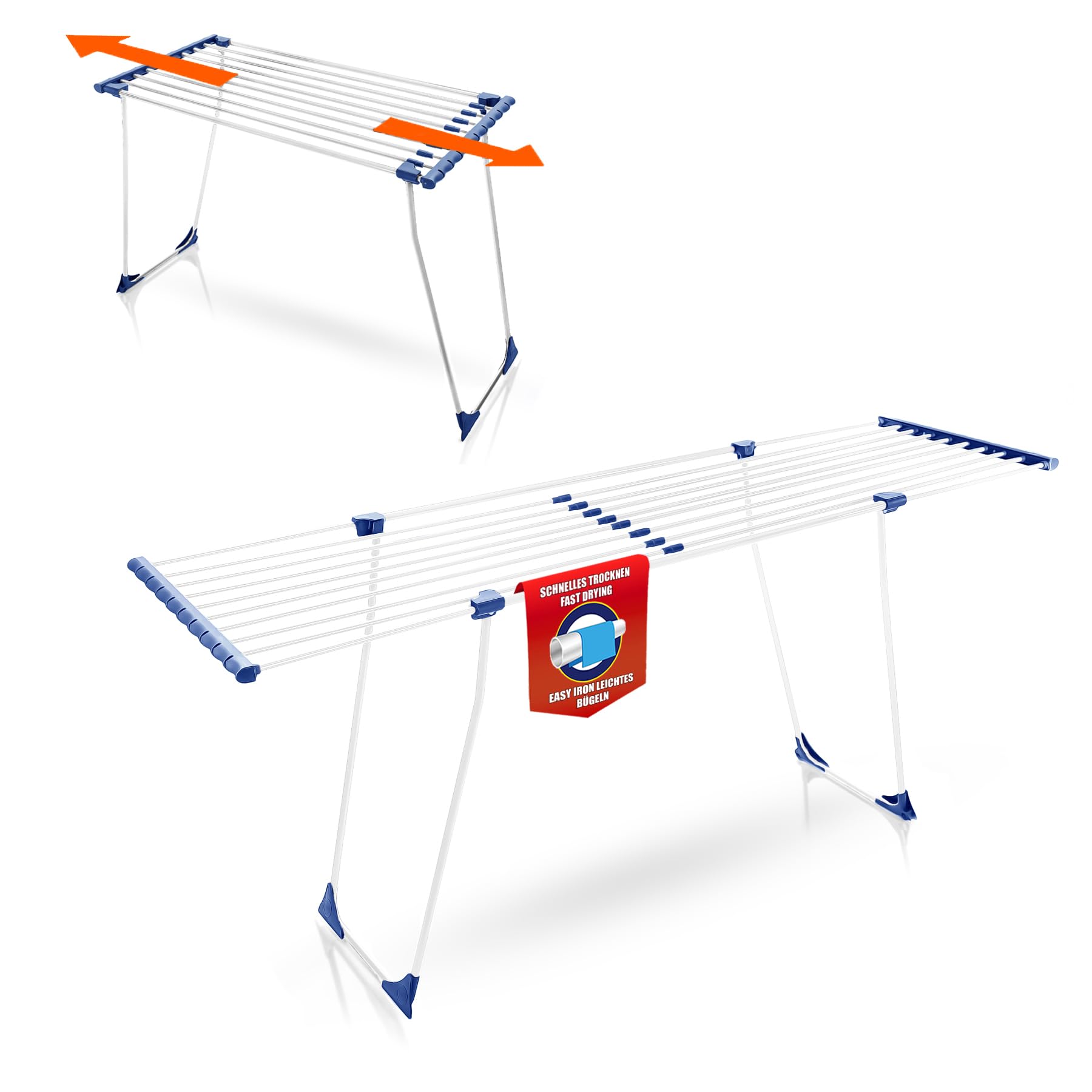 Einzelheiten: Produktinformationen "Teleskop Wäscheständer für Bettwäsche 20m - ausziehbar - Flügelwäscheständer Wäschetrockner Ständer" BigDean Teleskop Wäscheständer - ideal für Bettwäsche und große WäschestückeDieser clevere Wäschetrockner ist optimal für Bettwäsche, da er für 10-20 Meter Trockenfläche ausgezogen werden kann - und das ohne störende Querstreben.Somit ist das Aufhängen von Bettlaken, großen Handtüchern, Decken, Tischdecken oder Spannbetttüchern für dich kein Problem mehr.Dank der stufenlos ausziehbaren Teleskopstangen kannst du den XXL Wäscheständer an die jeweiligen Maße deiner Wäsche anpassen - von kleinen Kleidungsstücken bis zu großen Betttüchern.Die extra dicken Stangen sorgen für eine bessere Luftzirkulation und somit ein schnelleres Trocknen der Wäsche.Besonders clever sind die integrierten Kleinteilehalter für Socken, Taschentücher, uvm. Die 4 Standfüße sind kunststoffummantelt und verhindern das Verkratzen deines Bodens. Zur leichteren Manövrierbarkeit (auch bei bestücktem Wäscheständer) sorgen die 2 in den Standfüßen integrierten Rollen.Die Wäsche bitte gleichmäßig auf der gesamten Fläche zum Aufhängen verteilen.Nach der Verwendung wird empfohlen, den Wäscheständer an einen trockenen Ort zu stellen und vor Sonneneinstrahlung geschützt aufzubewahren.Er kann mit einem feuchten Tuch gereinigt werden.Den Wäscheständer bitte nicht als Ablage oder Abstellmöglichkeit verwenden. Maximale Traglast: ca. 20 kgDetails:- Maße geöffnet (nicht ausgezogen): ca. 112 x 55 x 90 cm- Maße geöffnet (voll ausgezogen): ca. 200 x 55 x 90 cm- Maße zusammengeklappt: ca. 55,5 x 4 x 112,5 cm- Material: Stahl, epoxidpulverbeschichtet- Standort: Ideal für jede Umgebung- Leinenlänge: 10 - 20 Meter- TÜV-SÜD EK5 / AK8; AfPS GS mit der Prüfungsnummer S 60131281 geprüft.- geprüft durch den TÜV Rheinland mit der Prüfnummer S 60131281. Für mehr Informationen bitte die Homepage von TÜV Rheinland besuchen und sich dort zur Suche in die Certipedia Datenbank begeben. Dort findest du die Prüfnummer 60131281.Ergebnis: Produkt und Fertigungsstätte erfüllen §20 und §21 des Produktsicherheitsgesetzes.