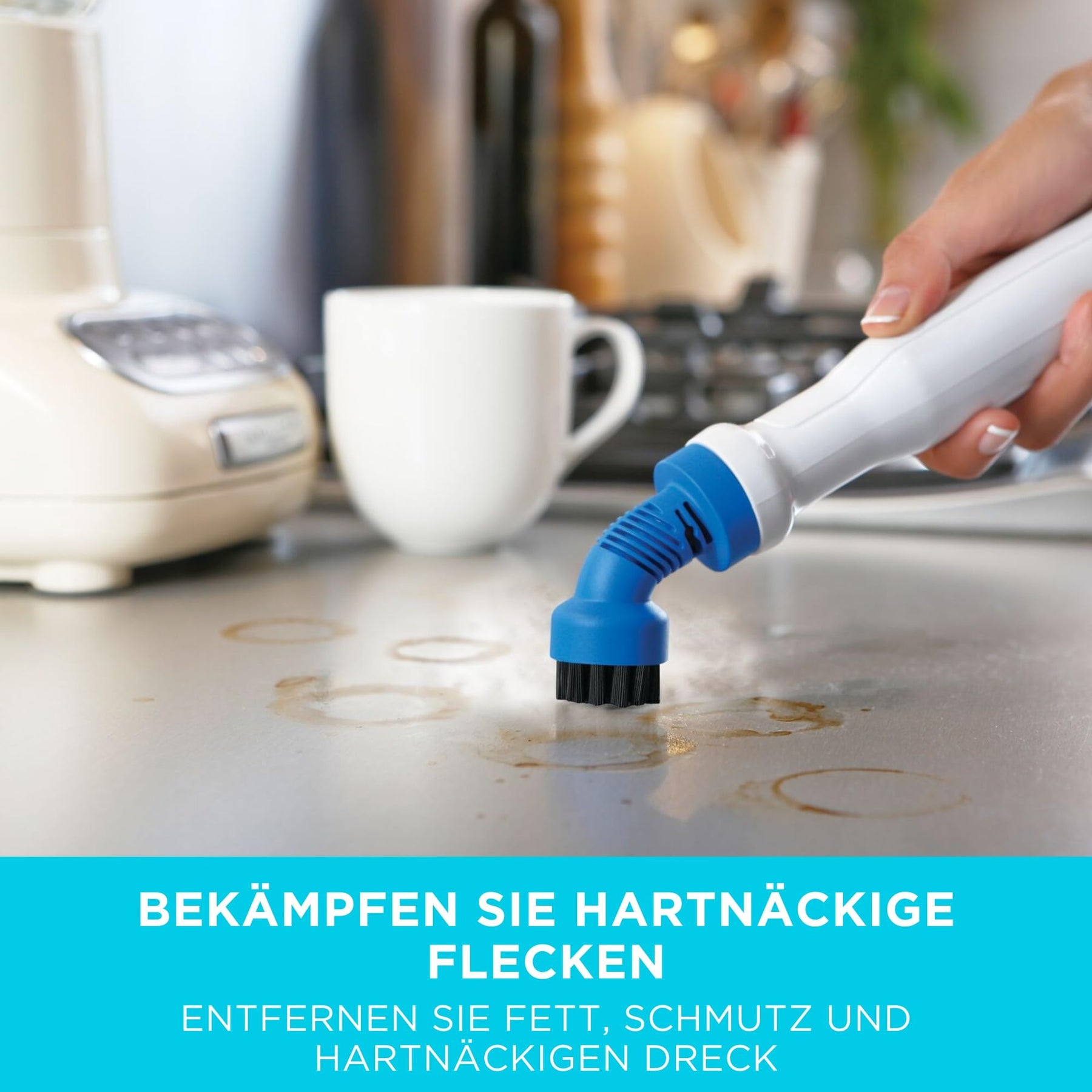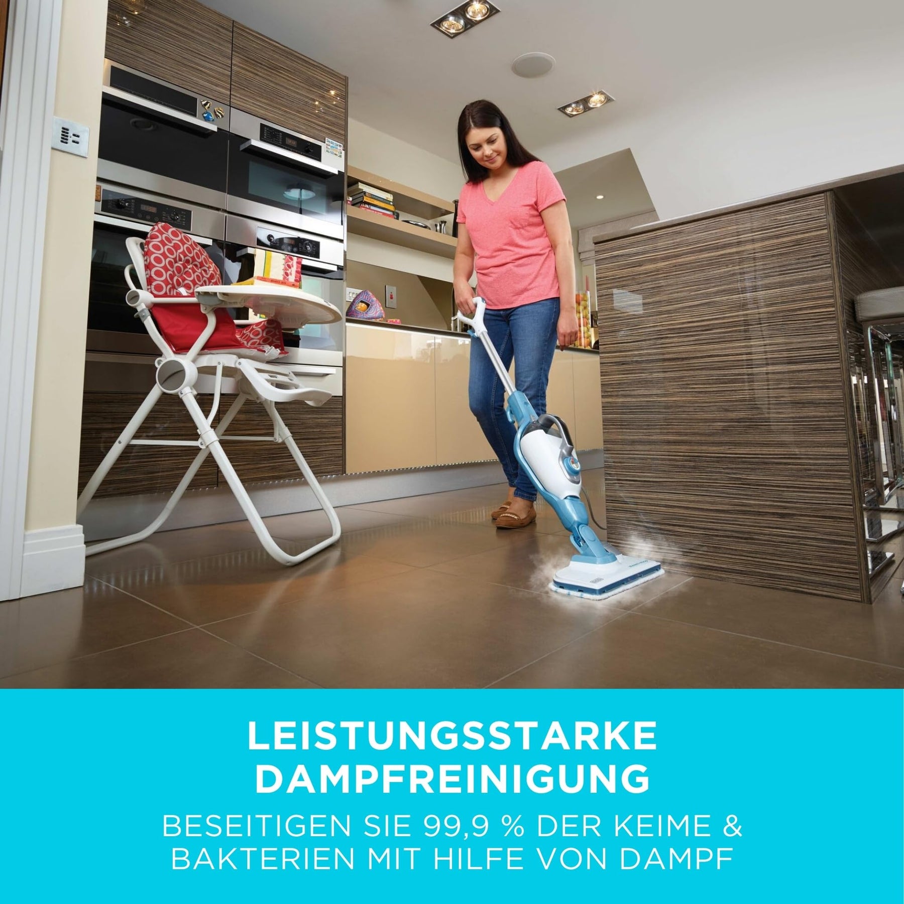 Der BLACK+DECKER 1300 Watt Steam Mop mit 12-teiligem Zubehörset ist ein leistungsstarker und vielseitiger Dampfreiniger, der für eine Vielzahl von Haushaltsoberflächen entwickelt wurde. Mit seinem innovativen SteaMitt Silikonhandschuh beseitigt dieser Dampfreiniger 99,9% der Keime und Bakterien nur mit Hilfe von Leitungswasser und sorgt so für eine sichere und umweltfreundliche Reinigung Ihres Zuhauses. Die AutoSelect-Technologie passt den Dampfstoß automatisch an den Bodentyp an und sorgt so für optimale Ergebnisse. Egal, ob Sie versiegelte Holzböden, Fliesen, Arbeitsplatten, Spiegel oder sogar Teppiche auffrischen möchten, der vielseitige Steam-Mop passt sich einfach Ihren Bedürfnissen an. Dieser Steam Mop ist auf Komfort und Schnelligkeit ausgelegt. Mit einem 500 ml Wassertank und einer Aufheizzeit von nur 15 Sekunden können Sie bis zu 20 Minuten lang die kraftvolle Dampfreinigung nutzen und so Ihre Arbeit schneller und effizienter erledigen. Sein geringes Gewicht und das 6 m lange Kabel sorgen für leichte Handhabung, so dass Sie jeden Winkel Ihrer Wohnung mühelos reinigen können. Der Extradampf per Fußklick hilft Ihnen dabei, hartnäckige Flecken und Ablagerungen zu entfernen. Das abnehmbare Handgerät und der SteaMitt-Handschuh erleichtern das Bearbeiten von engen Stellen, schwer zugänglichen Bereichen und empfindlichen Oberflächen und sorgen für eine tiefenreine Sauberkeit. Das umfangreiche Zubehörset enthält alles, was Sie für eine gründliche Reinigung im Haushalt benötigen. Vom flexiblen Schlauch und der verstellbaren Düse bis hin zum Teppichgleiter zur Auffrischung von Teppichen - jedes Zubehörteil wurde entwickelt, um Ihre Reinigungsgewohnheiten zu verbessern. Die Drahtbürste und die kleine Bürste erleichtern das Reinigen von Grills, Herdplatten und Duschwänden, während die Mikrofaser-SteaMitt-Pads ideal sind, um Schmutz und Dreck von empfindlichen Oberflächen zu entfernen. Die Drahtbürste und die kleine Bürste sind besonders nützlich für die Reinigung von Grills, Herdplatten und Duschwänden. Um Schmutz und Dreck von empfindlichen Oberflächen zu entfernen, eignen sich die SteaMitt Mikrofaser-Pads hervorragend. Revolutionieren Sie Ihre Reinigungsgewohnheiten mit dem BLACK+DECKER 13-in-1 Steam-Mop mit abnehmbarem Handreiniger und dem innovativen SteaMitt Handschuh. Diese Dampfbesen kombiniert tiefenreine Sauberkeit mit Hilfe von Dampf mit einer Vielzahl von Zubehörteilen und einem leichten, benutzerfreundlichen Design.