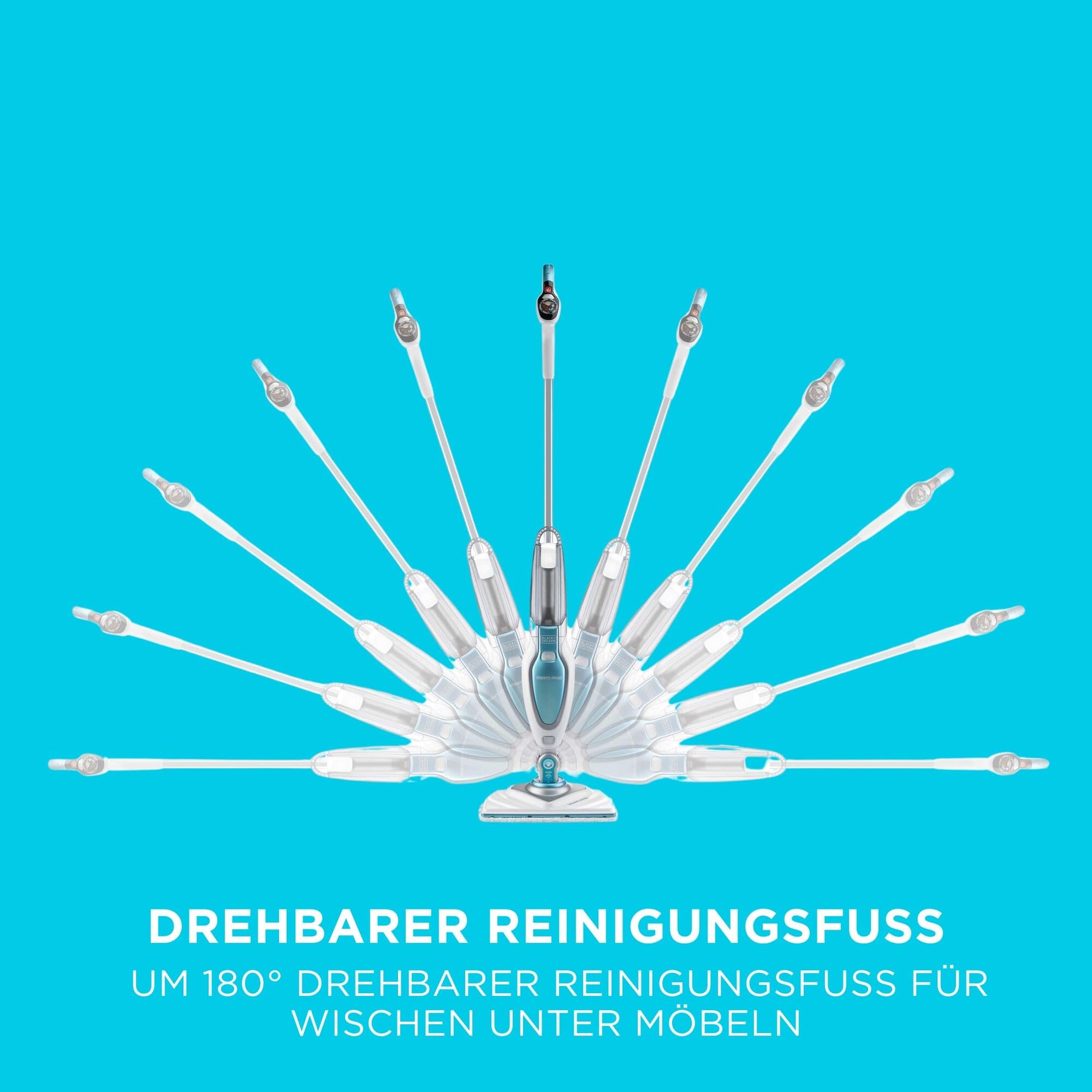 Innerhalb von nur 15 Sekunden einsatzbereit, spart der Steam-Mop wertvolle Zeit, ohne Kompromisse bei der Leistung einzugehen. Der großzügige 460ml Wassertank kann leicht mit Leitungswasser befüllt werden. Besonders praktisch: Der Tank wechselt die Farbe von rot zu blau, wenn das Gerät einsatzbereit ist. Mit seinem um 180° schwenkbaren Fuß ermöglicht der Steam Mop problemlos das Wischen unter Möbel oder engen Zwischenräumen und sorgt so für eine gründliche Reinigung in allen Wohnbereichen.
