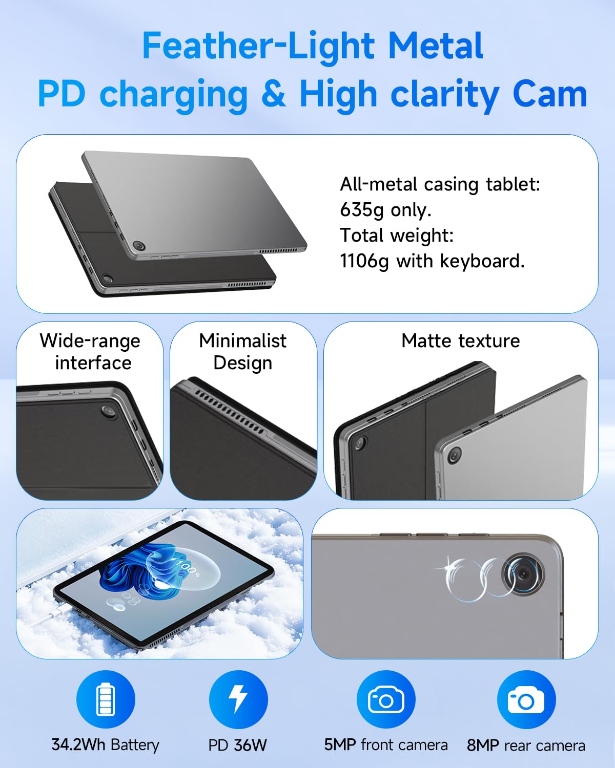 - 【Langlebiger 635g Metallkorpus + Enthaltene Tastatur/Kickstand (1106g)】 Gebaut mit einem robusten Aluminiumgehäuse (9,6 mm dick, 635 g), vereint dieser leichte Tablet-PC Robustheit und Portabilität. Im Lieferumfang enthalten sind eine magnetische Tastatur und ein Kickstand (gesamt 1106 g), die sofortigen Wechsel zwischen Tablet-Kreativität und Laptop-Produktivität für dringende Aufgaben ermöglichen