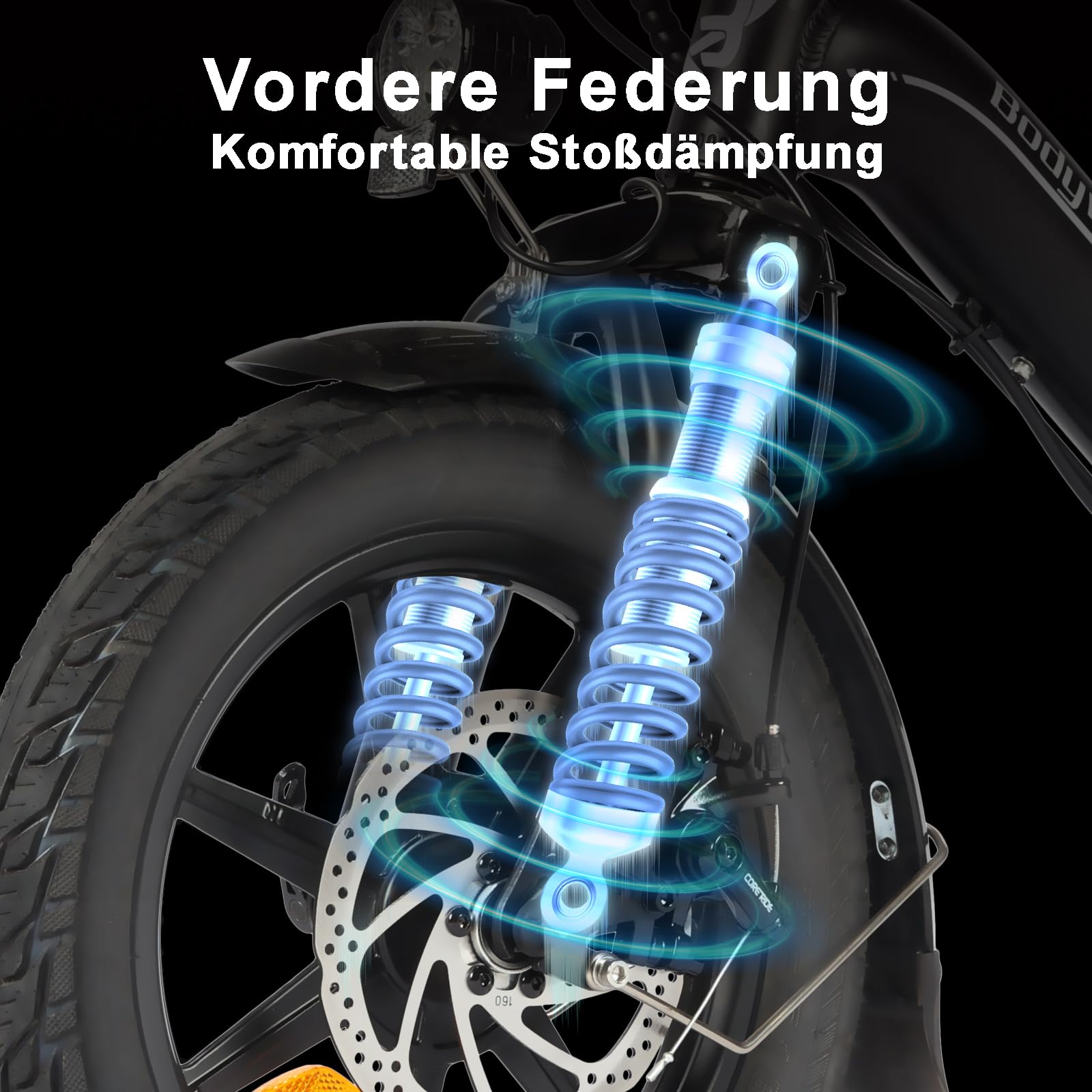 - 【Sichereres Fahren】Das Bodywel T16PRO Elektrofahrrad ist mit vorderen und hinteren Doppelscheibenbremsen ausgestattet, die die Bremsleistung erheblich verbessern und den Bremsweg verkürzen. Die Sicherheits-Frontlampe, das Rücklicht und die Fahrradklingel verbessern Ihre Sicherheit, insbesondere nachts.