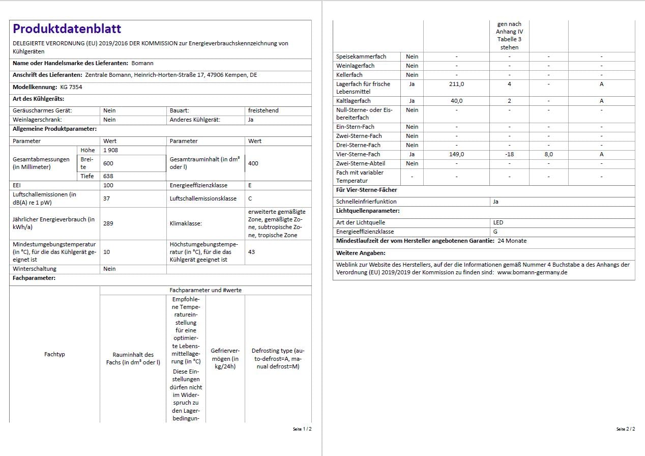 Einzelheiten: Spezifikation Nutzinhalt: 400 Liter - Kühlen: 251 Liter - Gefrieren: 149 Liter MultiAirflow-System: optimale Luftzirkulation und gleichmäßige Kühlung im Kühl- & Gefrierbereich Total No Frost: keine Eisbildung, kein Abtauen erforderlich LED Frontdisplay mit Touch Control Elektronische Temperaturregelung Kühl- & Gefrierteil getrennt regelbar Schnellkühl- & Gefrierfunktion Akustische Alarmfunktion bei offen stehender Kühlraumtür Eingelassene Handgriffe Justierbare Standfüße Laufrollen Inverter Kompressor Kühlen LED Innenraumbeleuchtung Temperaturbereich: +2°C ~ +8°C Frischhalteschubfach mit variabler Temperaturzone 4 Glasablagen 6 Türablagen Eierablage Gefrieren 4 Sterne-Kennzeichnung Temperaturbereich: -16°C ~ -24°C Gefriervermögen: 8 kg / 24 h Lagerzeit bei Störung: max. 6 h 2 große Gefrierschubladen Obere Gefrierschublade mit ischenablage (Gefriertablett) Eiswürfelschale Technische Daten Anschlussspannung: 220-240 V~/50 Hz Leistungsaufnahme (Abtauen): 175 W Klimaklasse: SN/N/ST/T (+10°C ~ +43°C) Kühlmittel: R600a Betriebsgeräusch: 37 dB Verbrauchsdaten Energieverbrauch / 24 h: 0,759 kWh Energieverbrauch / Jahr: 289 kWh (gem. EU-Datenblatt nach Verordnung Nr. 2019/2016) Logistische Daten Gerät: 190.8 x 60.0 x 63.8 cm (HxBxT) Verpackung: 200.7 x 66.3 x 70.0 cm (HxBxT) Nettogewicht: 73.0 kg Bruttogewicht: 83.0 kg