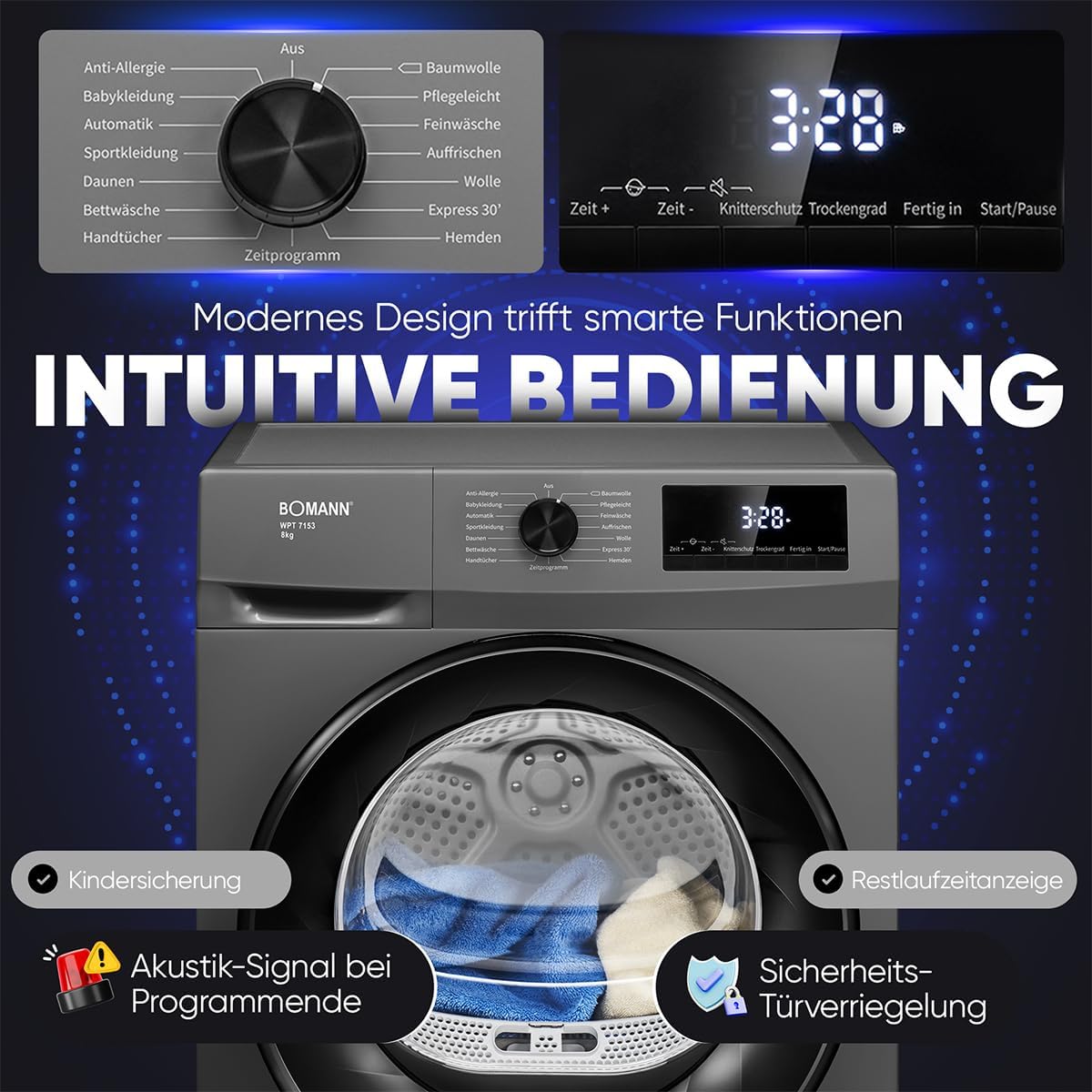 - Perfekt für die ganze Familie - Mit einer Kapazität von 8kg bietet der Wärmepumpentrockner ausreichend Platz für große Wäscheladungen und Familienwäsche