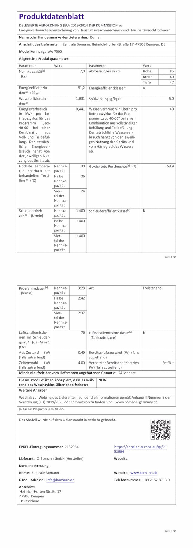 Einzelheiten: Bomann® Waschmaschine 7kg | 10 Jahre Motor-Garantie | effizienter Invertermotor | 1400 U/min | inkl. Aqua-Stop | bis 90°C | 15 Programme | Bomann Waschmaschine | Washing Machine | WA 7500 weiß