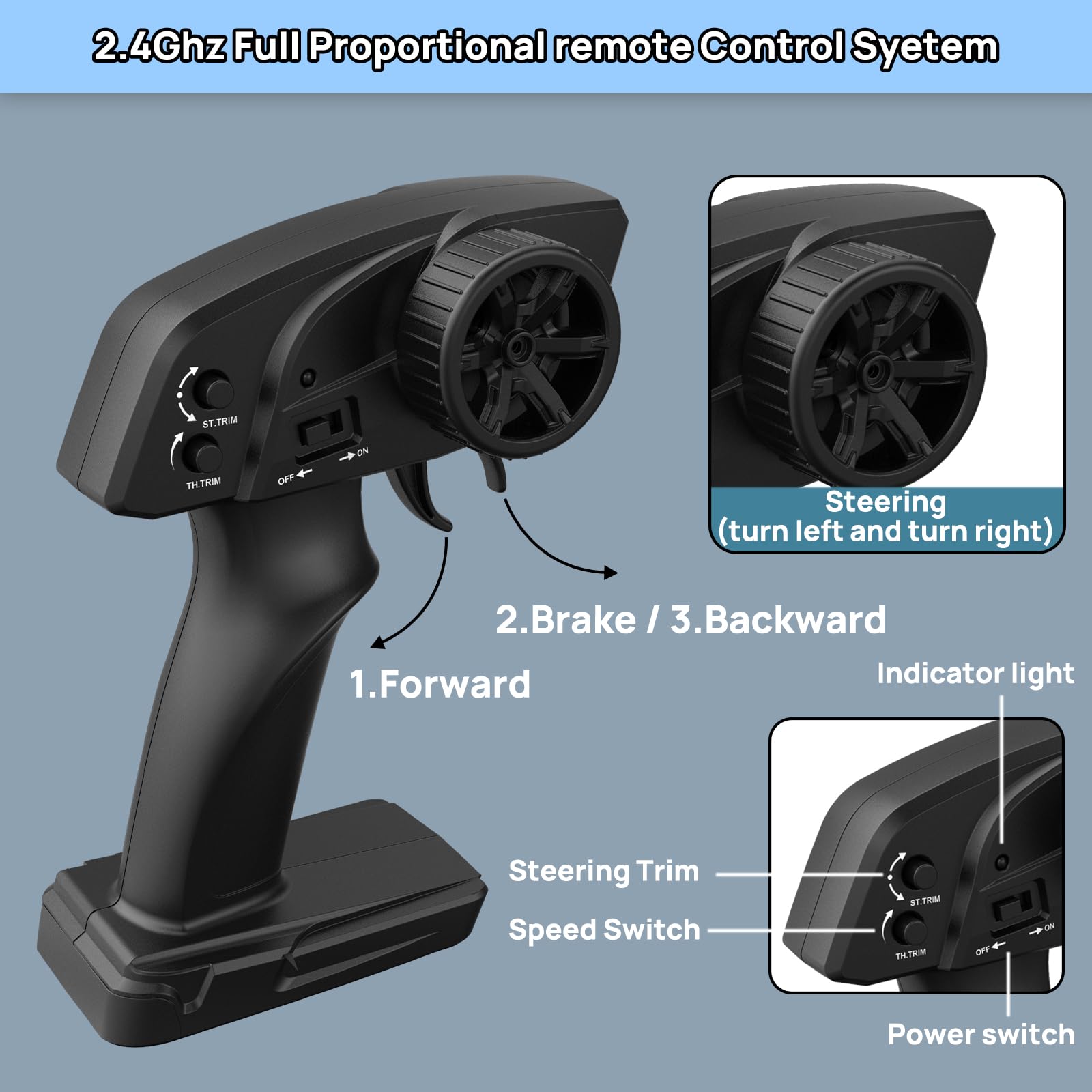 - Präzise Steuerung mit 2,4-GHz-Fernbedienung und Proportionallenkung: Übernehmen Sie das volle Kommando über Ihren Off-Road Ferngesteuerter Auto Truck mit einem fortschrittlichen 2,4-GHz-Fernsteuerungssystem, das eine proportionale Gas- und Lenkungssteuerung für überlegenes Handling bietet. Das Signal mit großer Reichweite (bis zu 163 Fuß) sorgt für eine nahtlose und reaktionsschnelle Steuerung, so dass mehrere ferngesteuerted auto ohne Interferenzen zusammen fahren können.
