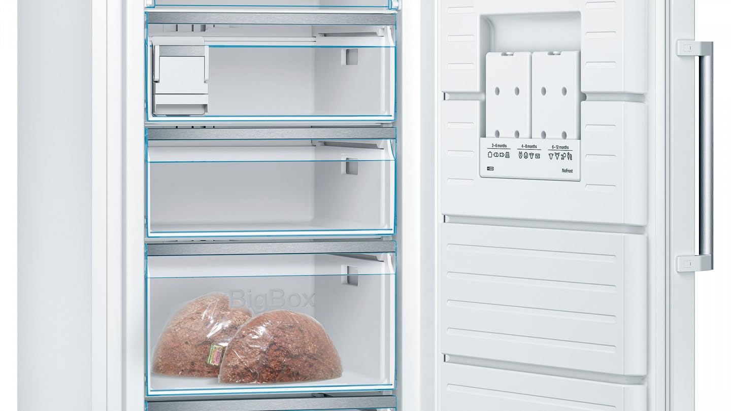 Bosch GSN58AWCV Freistehender Gefrierschrank Serie | 6 / Energieeffizienzklasse C / 366 l / 191 x 70 (H x B) / Weiß / LED-Beleuchtung / NoFrost / Abtauautomatik / mit 5 Schubladen / 1 BigBox / VarioZone / FreshSense / MultiAirflow System / MultiAlarm System / IceTwister / TouchControl: elektronische Temperaturregelung / SuperGefrieren / Temperaturalarm / Türalarm / Temperaturanzeige / inkl. Kälteakku. Hersteller: Bosch Modell: GSN58AWCV Energieeffizienzklasse (A bis G): C Jährlicher Energieverbrauch: 178 kWh/Jahr Nutzinhalt gesamt: 366 l Stern-Einstufung: **** Klimaklasse: SN-T Luftschallemission: leise bei 38 dB(A) re 1 pW Luftschallemissionsklasse: C Einbaugerät: Nein