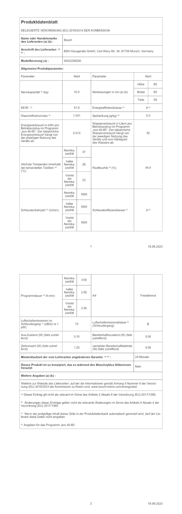 Die Bosch WGG256Z40 misst 84.5 cm in der Höhe und 59.8 cm in der Breite. Die Tiefe des Geräts beträgt 59.0 cm, mit geschlossener Türe 63.6 cm und mit geöffneter Türe 107.3 cm. Diese Maße machen sie zu einer idealen Wahl für die meisten Haushalte, da sie unter die meisten Arbeitsplatten passt.