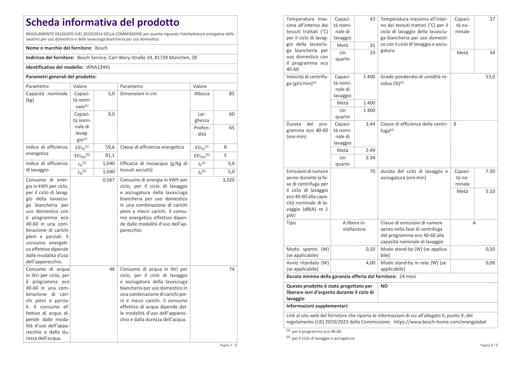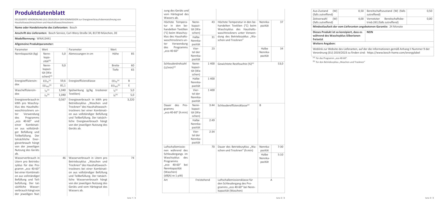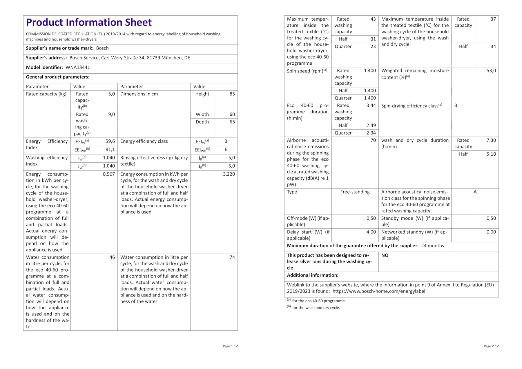 Einzelheiten: Bosch WNA13441 Serie 4 Waschtrockner Frontlader / E / 322 kWh/100 Wasch- und Trockenzyklen / 1400 UpM / 9/5 kg / weiß / Auto Dry / Iron Assist / EcoSilence Drive / SpeedPerfect