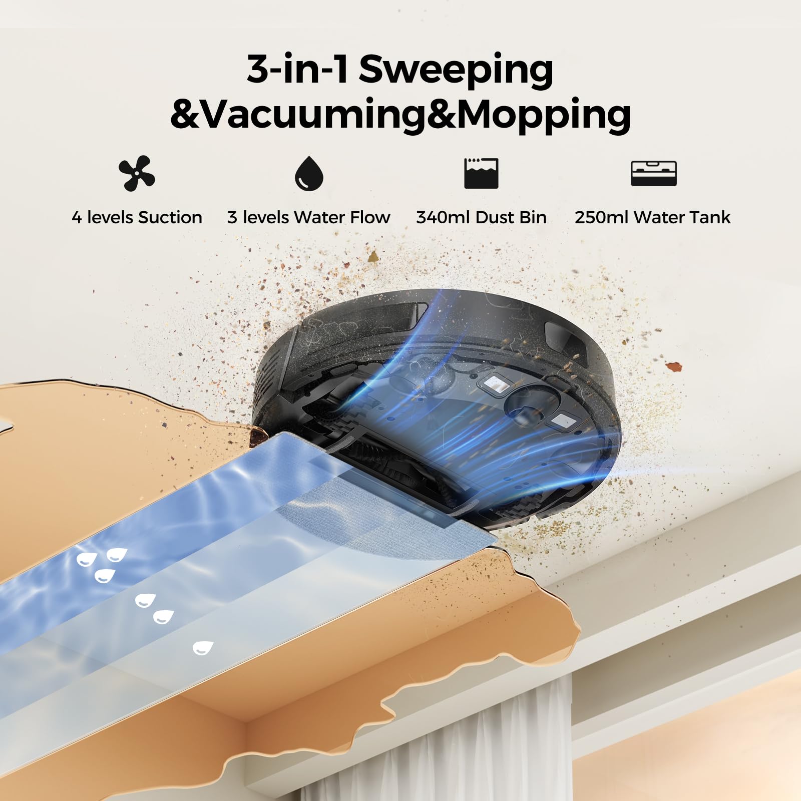- 【3 in 1 Saugen, Wischen, Kehren】Der B15 Roboterstaubsauger ist mit Seitenbürsten, V-förmigen Walzenbürsten, Wischmopps, 3-Stufen-Reinigung ausgestattet, wodurch die Reinigungszeit effektiv reduziert wird. 340ml Großraum-Staubbehälter, keine Notwendigkeit, Müll häufig zu fegen, und 250ml Großraum-Wasserpumpen-Wassertank, der Wasser genau steuern kann kein Leck und unterstützen 3 Stufen der Wasserflusseinstellung. Y-förmige Wischen, imitieren manuelle Wischen, kein Schmutz Auslassung, tiefe Reinigung des ganzen Hauses, B15 Roboter Staubsauger macht Ihren Boden sauber und tadellos.